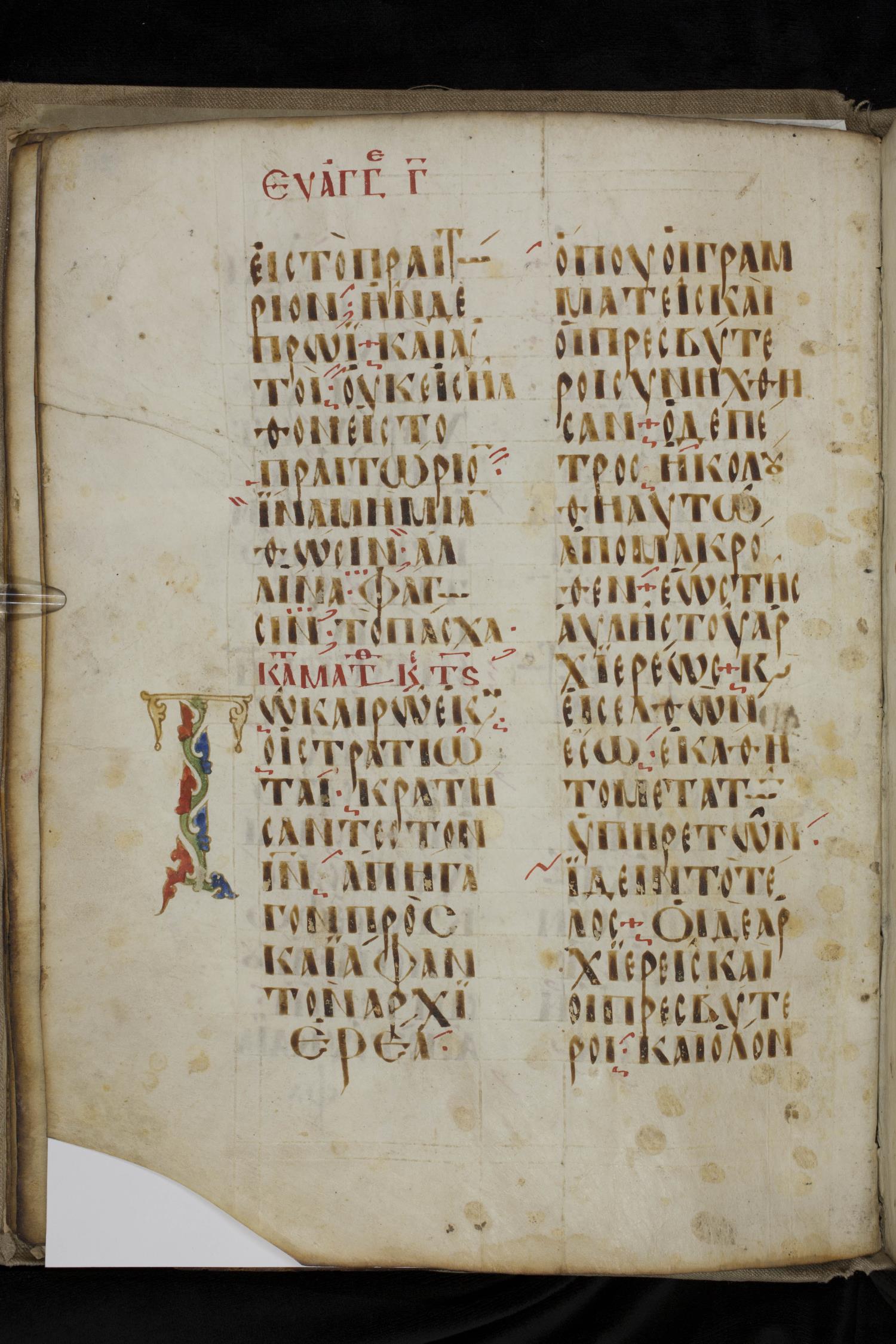 Ninth century majuscule lectionary on parchment; 88 leaves, 2 columns, 20 lines per column. Images were taken at the National Library of Greece in Athens.
