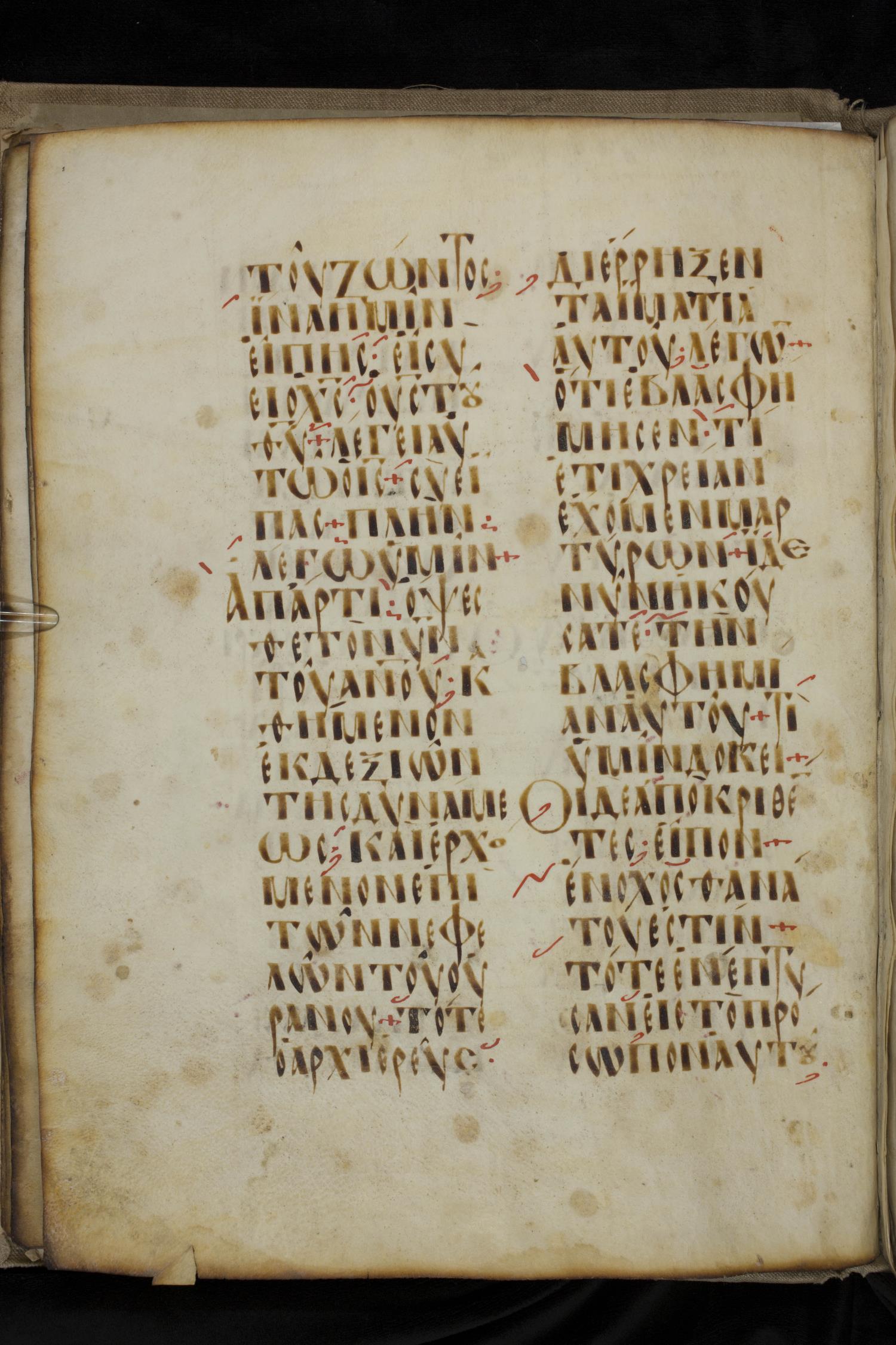 Ninth century majuscule lectionary on parchment; 88 leaves, 2 columns, 20 lines per column. Images were taken at the National Library of Greece in Athens.