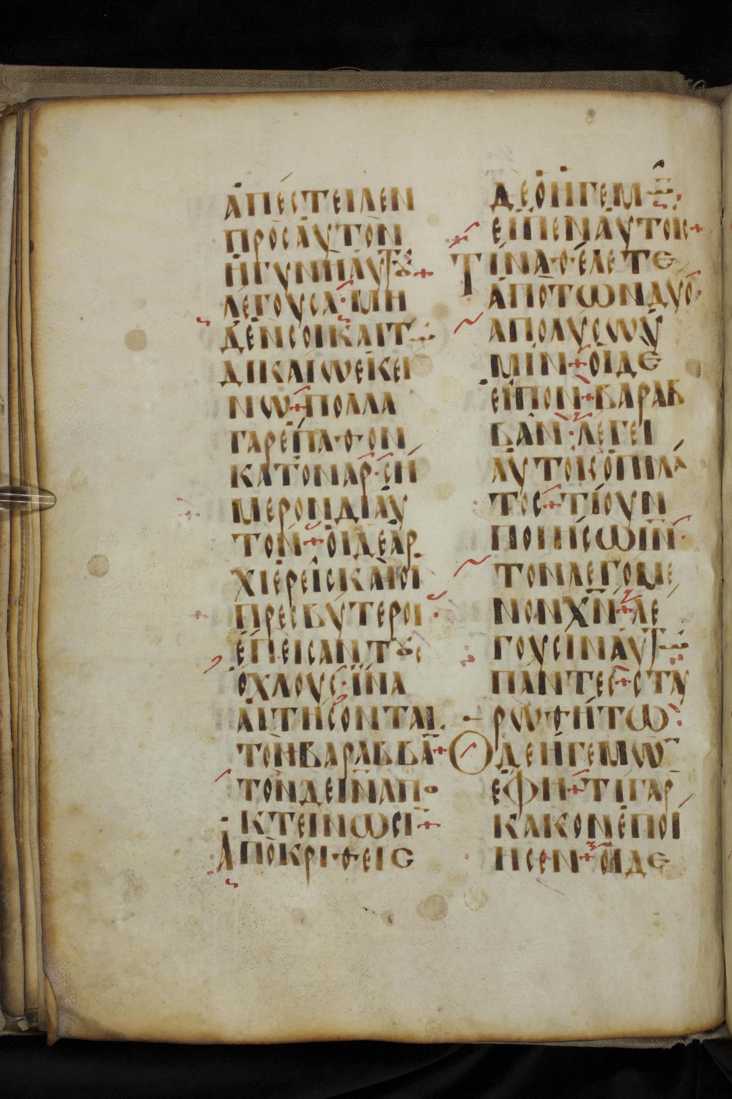 Ninth century majuscule lectionary on parchment; 88 leaves, 2 columns, 20 lines per column. Images were taken at the National Library of Greece in Athens.