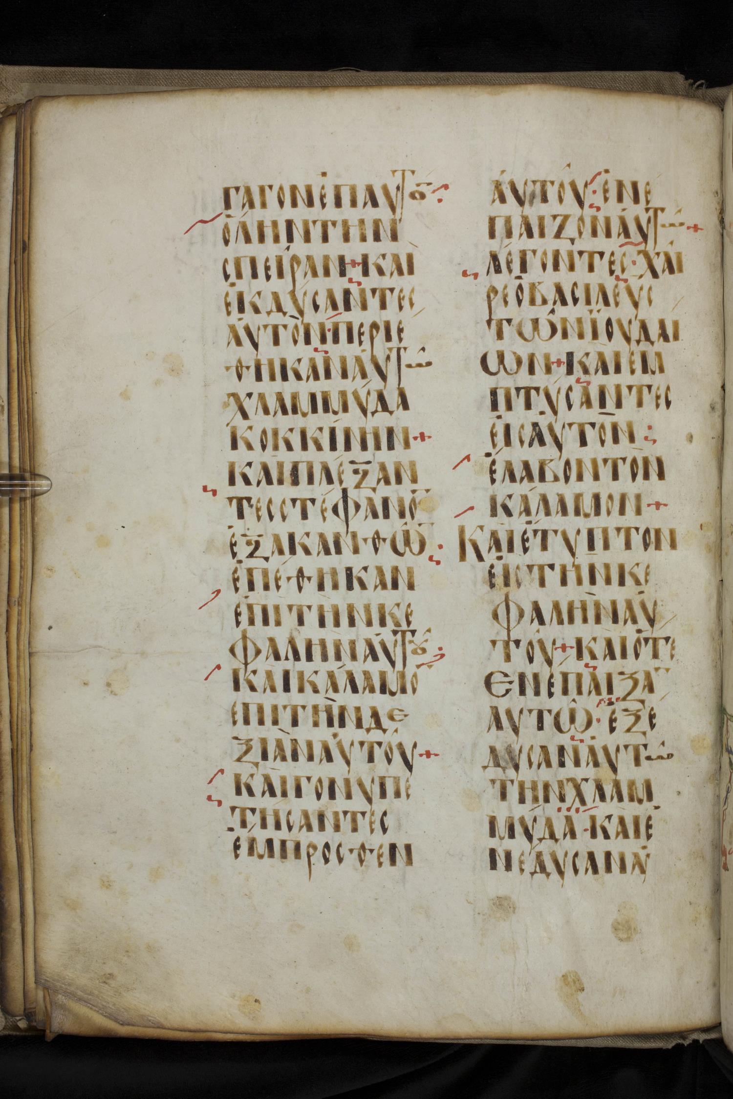 Ninth century majuscule lectionary on parchment; 88 leaves, 2 columns, 20 lines per column. Images were taken at the National Library of Greece in Athens.