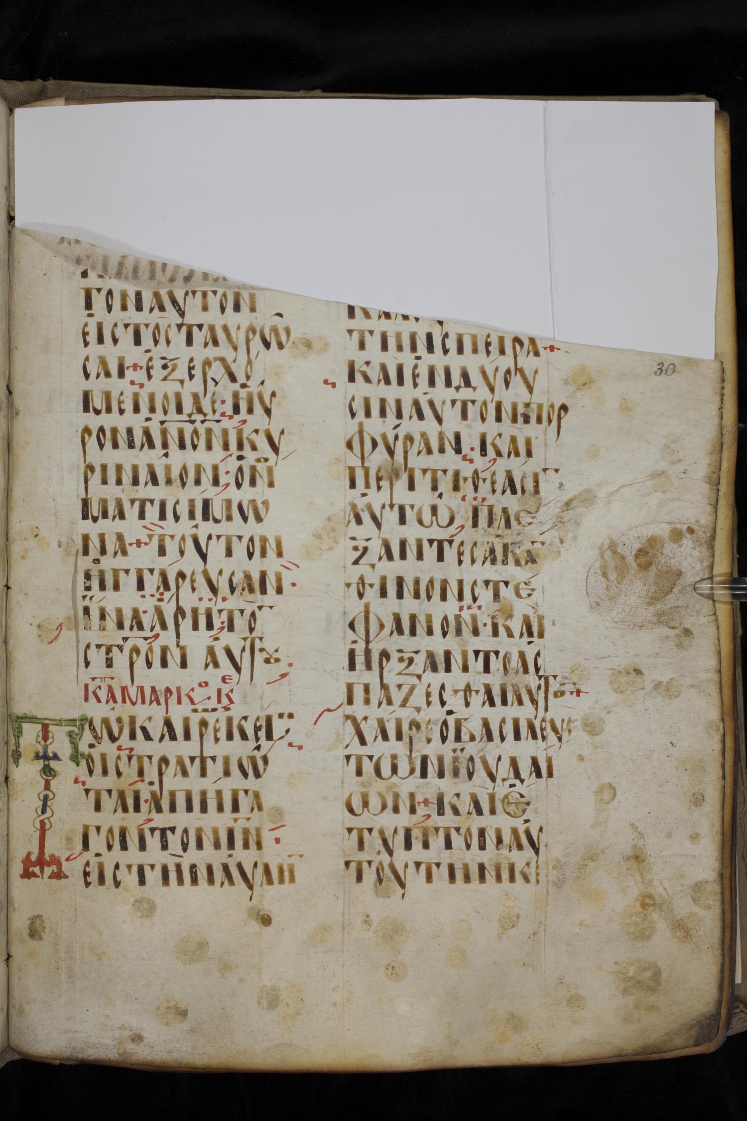Ninth century majuscule lectionary on parchment; 88 leaves, 2 columns, 20 lines per column. Images were taken at the National Library of Greece in Athens.
