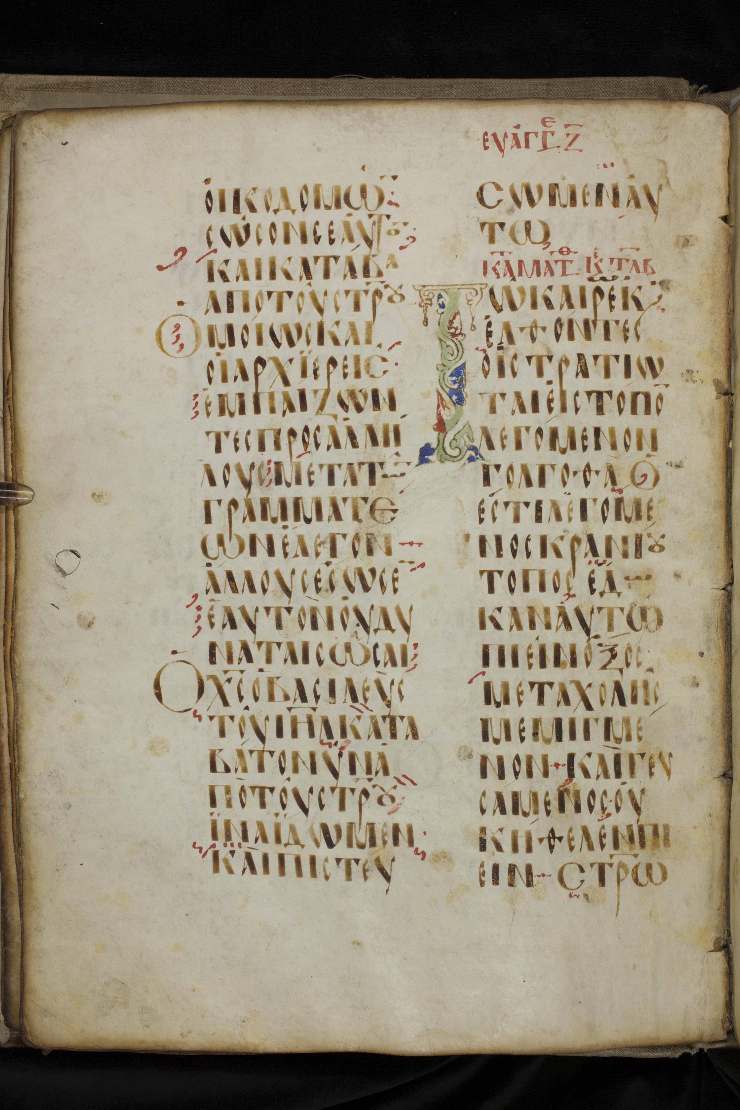 Ninth century majuscule lectionary on parchment; 88 leaves, 2 columns, 20 lines per column. Images were taken at the National Library of Greece in Athens.