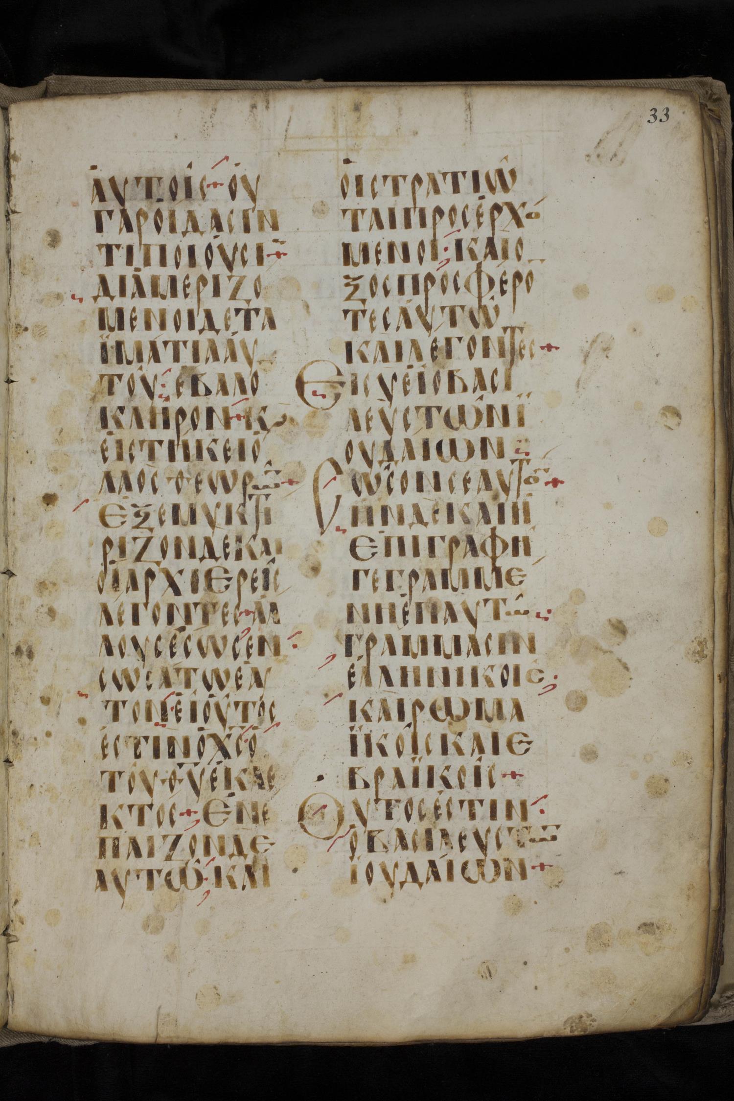 Ninth century majuscule lectionary on parchment; 88 leaves, 2 columns, 20 lines per column. Images were taken at the National Library of Greece in Athens.