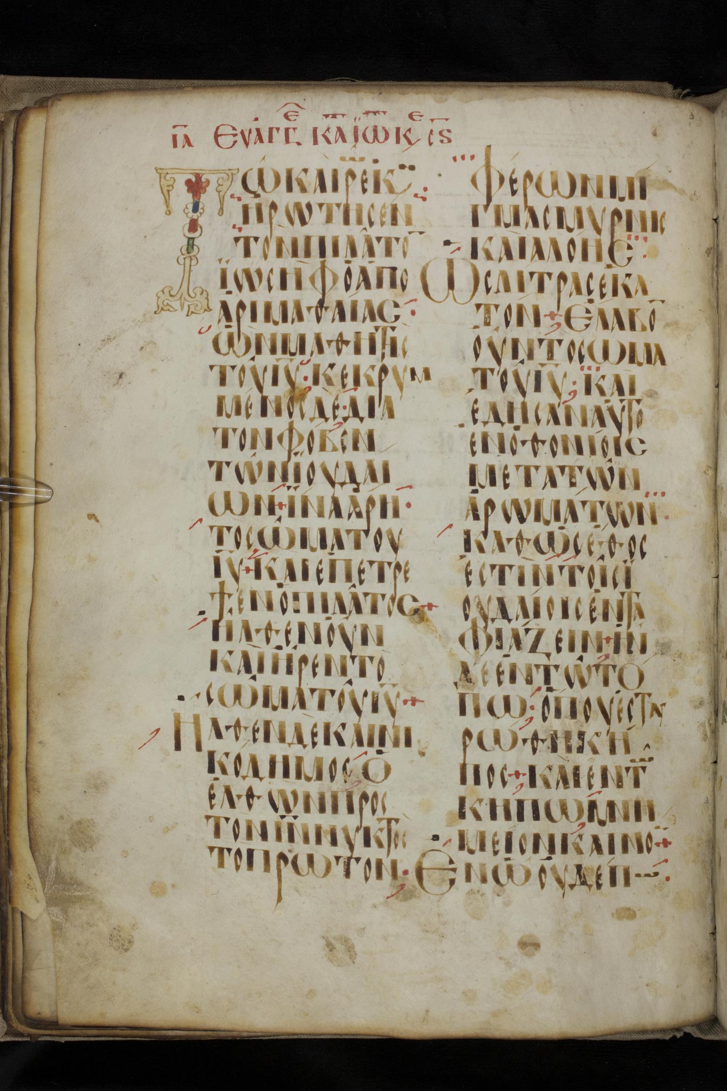 Ninth century majuscule lectionary on parchment; 88 leaves, 2 columns, 20 lines per column. Images were taken at the National Library of Greece in Athens.