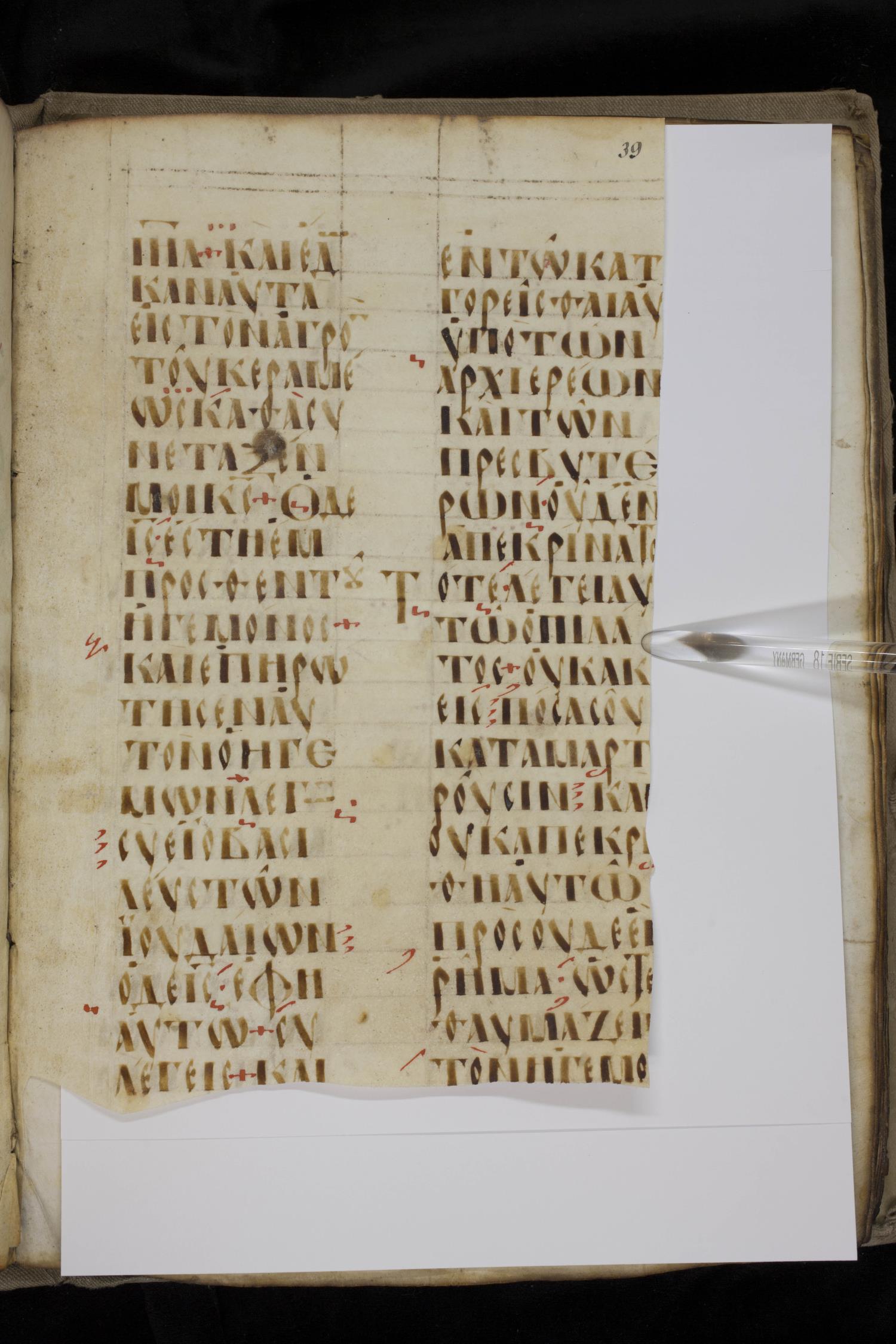 Ninth century majuscule lectionary on parchment; 88 leaves, 2 columns, 20 lines per column. Images were taken at the National Library of Greece in Athens.