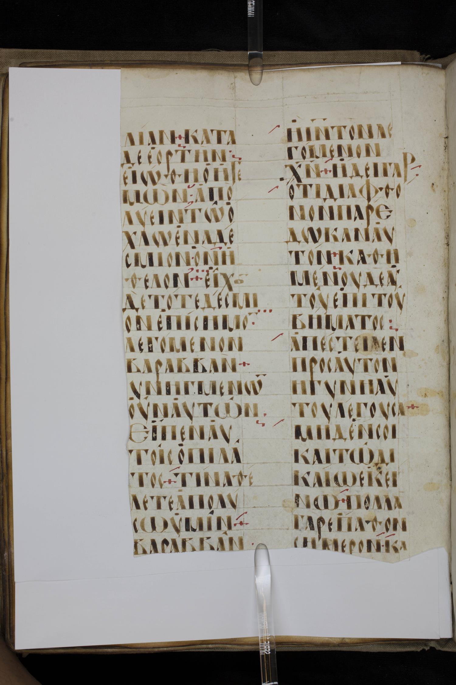 Ninth century majuscule lectionary on parchment; 88 leaves, 2 columns, 20 lines per column. Images were taken at the National Library of Greece in Athens.