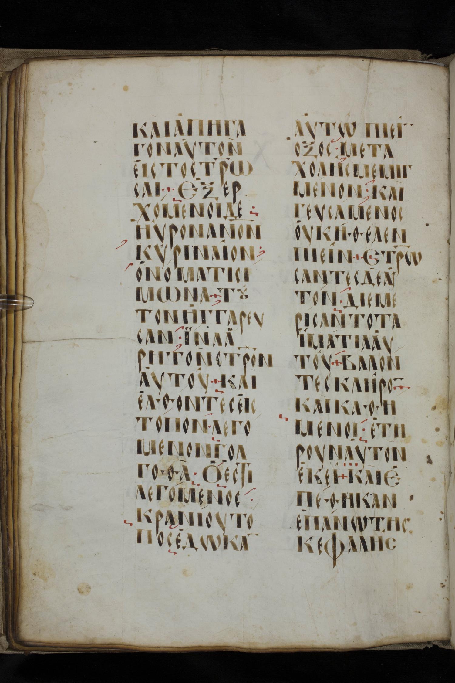 Ninth century majuscule lectionary on parchment; 88 leaves, 2 columns, 20 lines per column. Images were taken at the National Library of Greece in Athens.