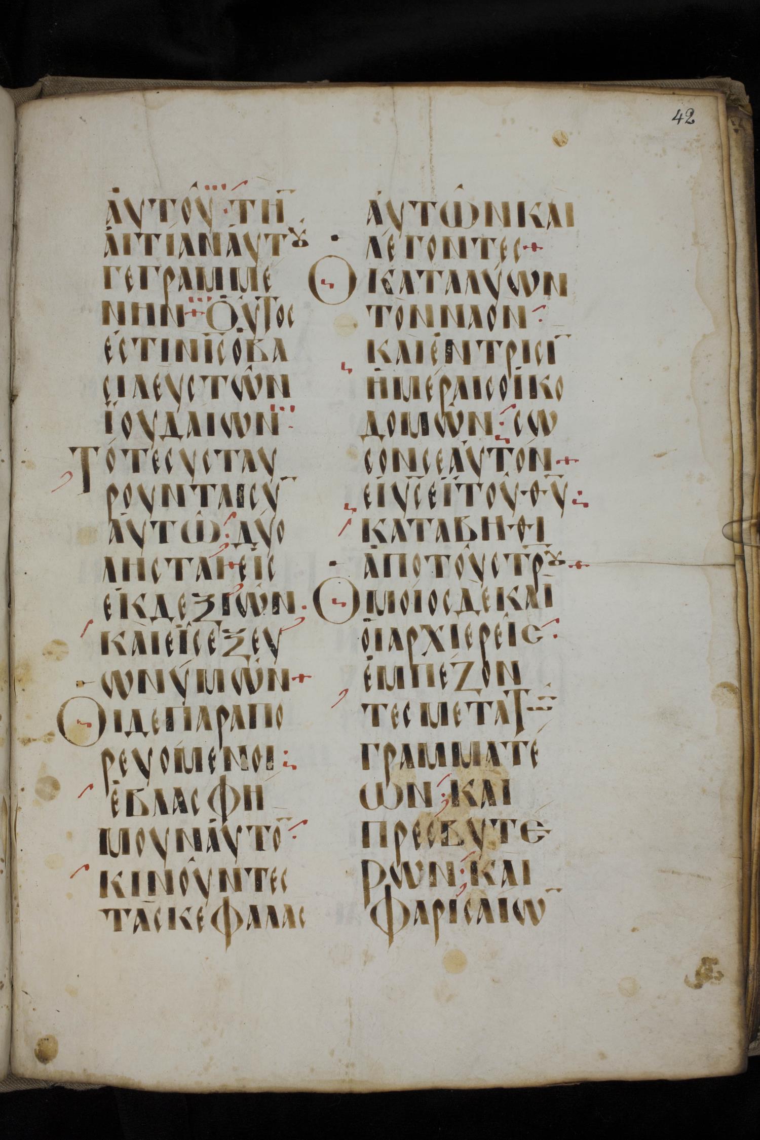 Ninth century majuscule lectionary on parchment; 88 leaves, 2 columns, 20 lines per column. Images were taken at the National Library of Greece in Athens.