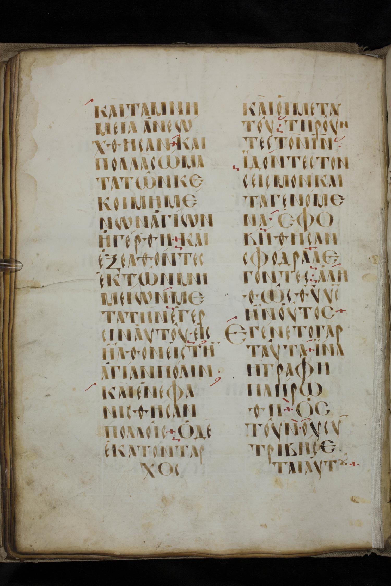 Ninth century majuscule lectionary on parchment; 88 leaves, 2 columns, 20 lines per column. Images were taken at the National Library of Greece in Athens.