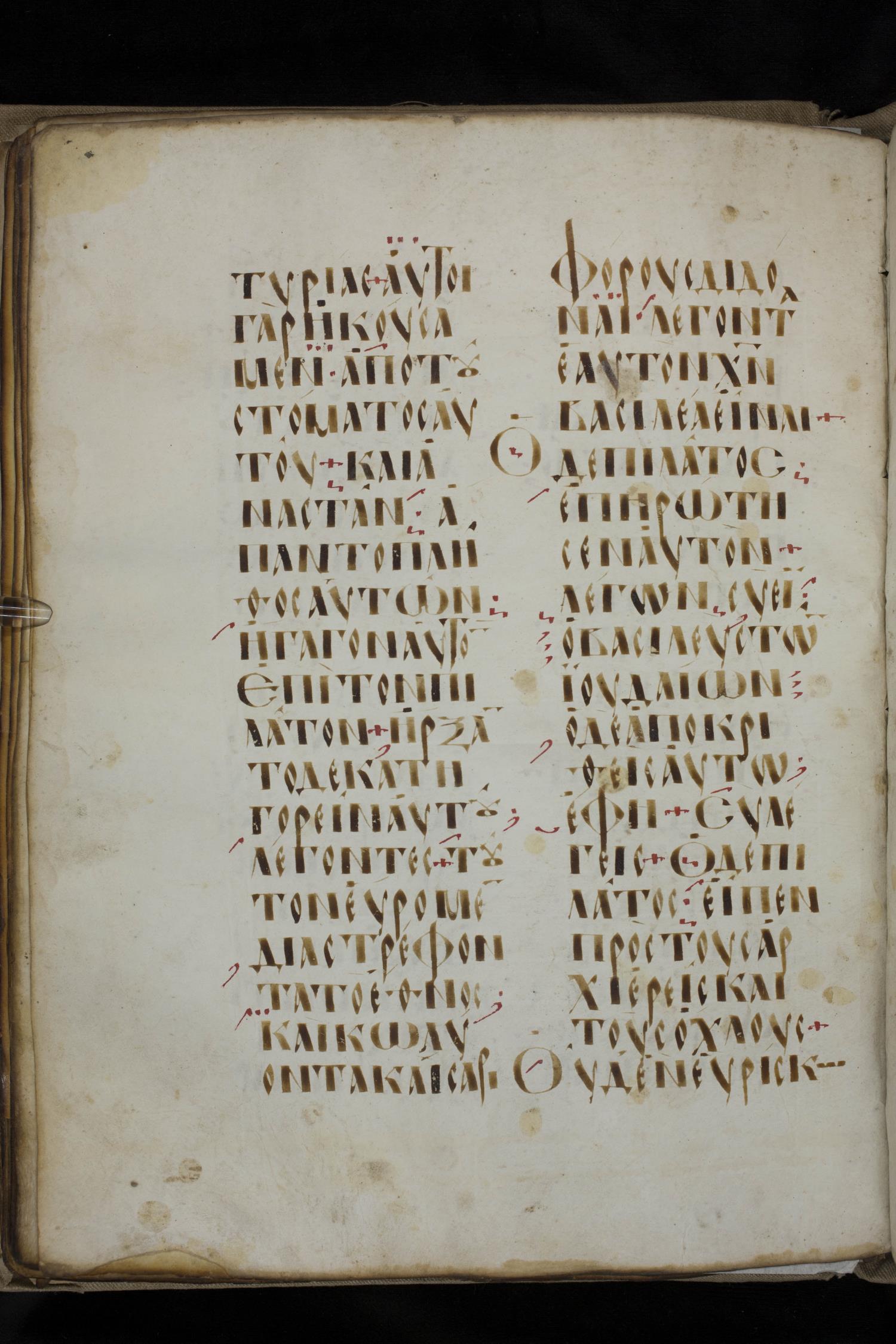 ἤρξαντο δὲ κατηγορεῖν αὐτοῦ λέγοντες Τοῦτον εὕραμεν διαστρέφοντα τὸ ἔθνος ἡμῶν καὶ κωλύοντα φόρους Καίσαρι διδόναι καὶ λέγοντα αὑτὸν / ἑαυτὸν χριστὸν βασιλέα εἶναι.