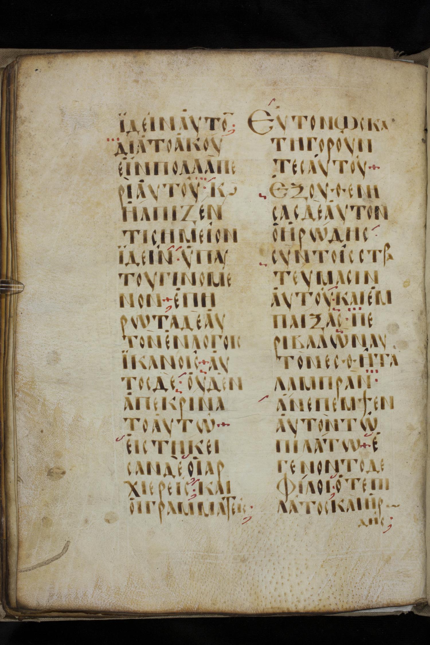 Ninth century majuscule lectionary on parchment; 88 leaves, 2 columns, 20 lines per column. Images were taken at the National Library of Greece in Athens.