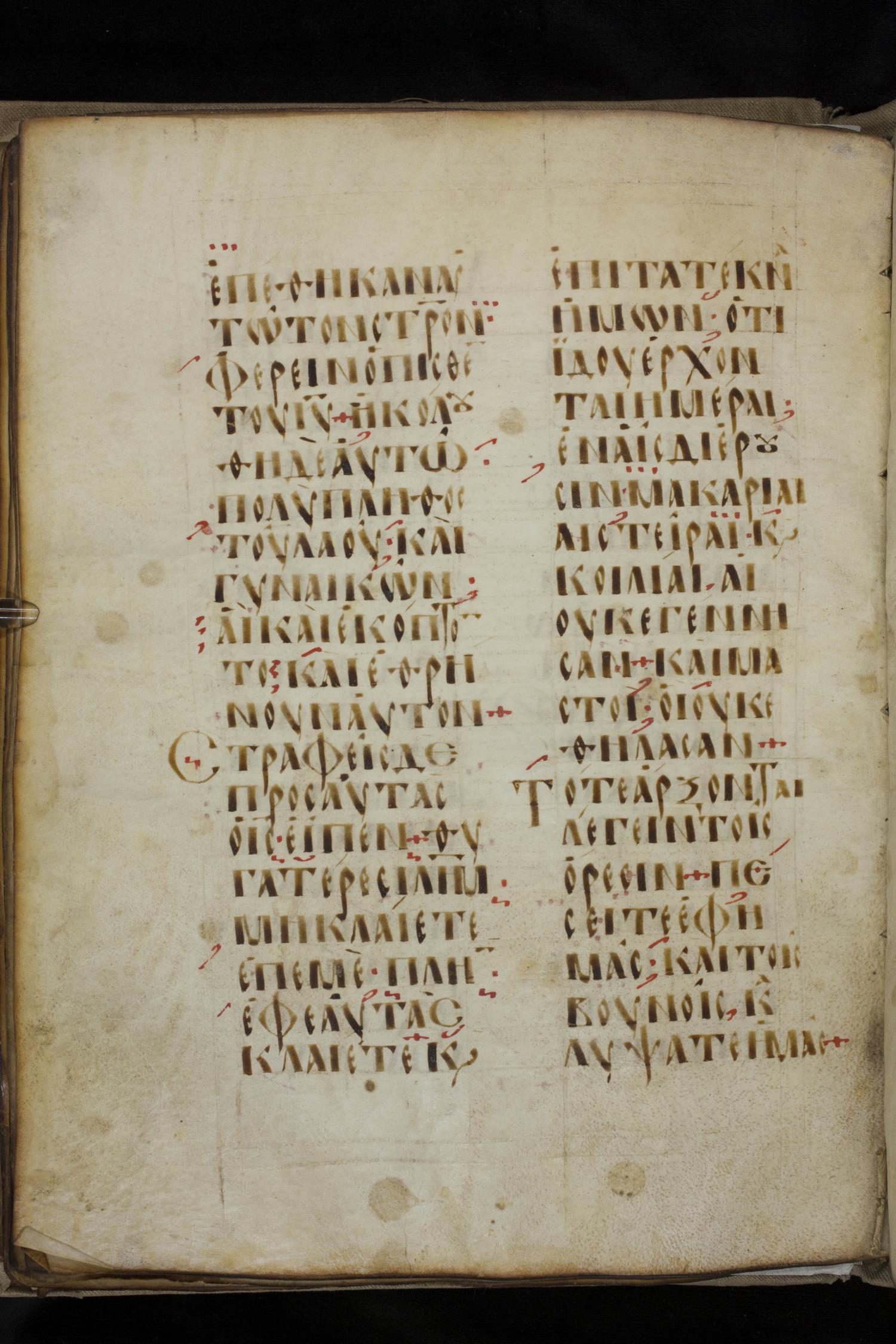 Ninth century majuscule lectionary on parchment; 88 leaves, 2 columns, 20 lines per column. Images were taken at the National Library of Greece in Athens.