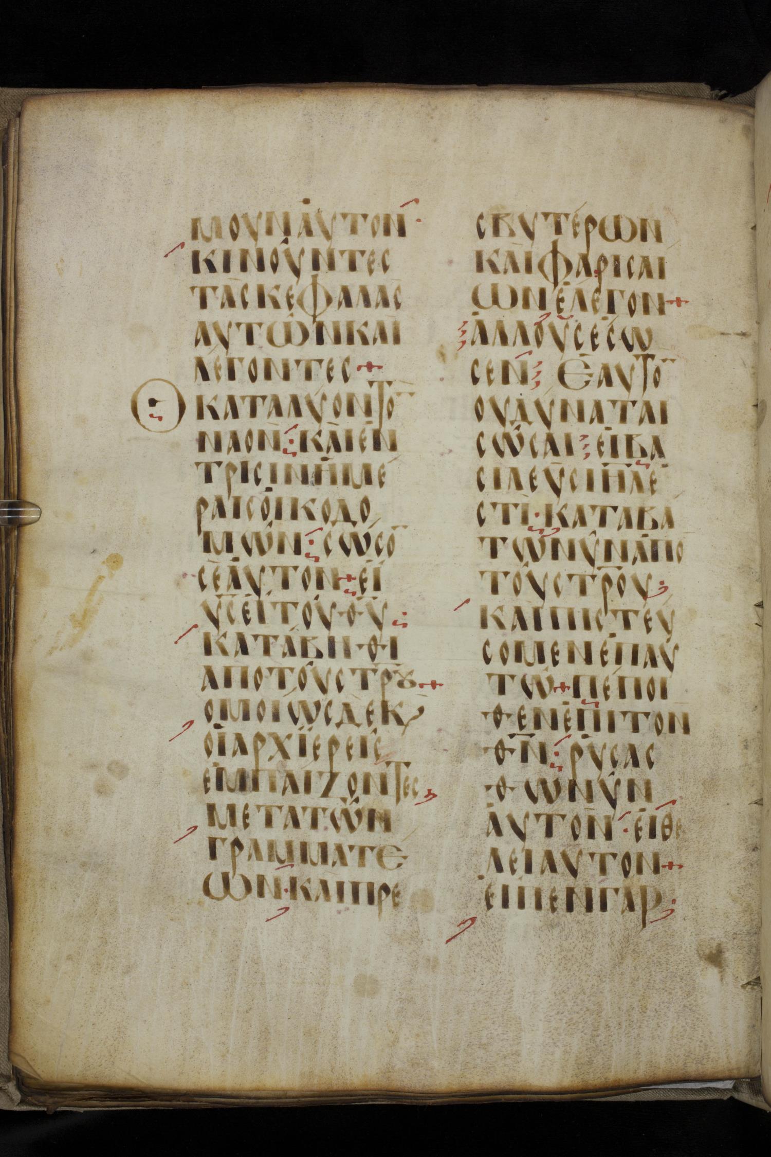 Ninth century majuscule lectionary on parchment; 88 leaves, 2 columns, 20 lines per column. Images were taken at the National Library of Greece in Athens.