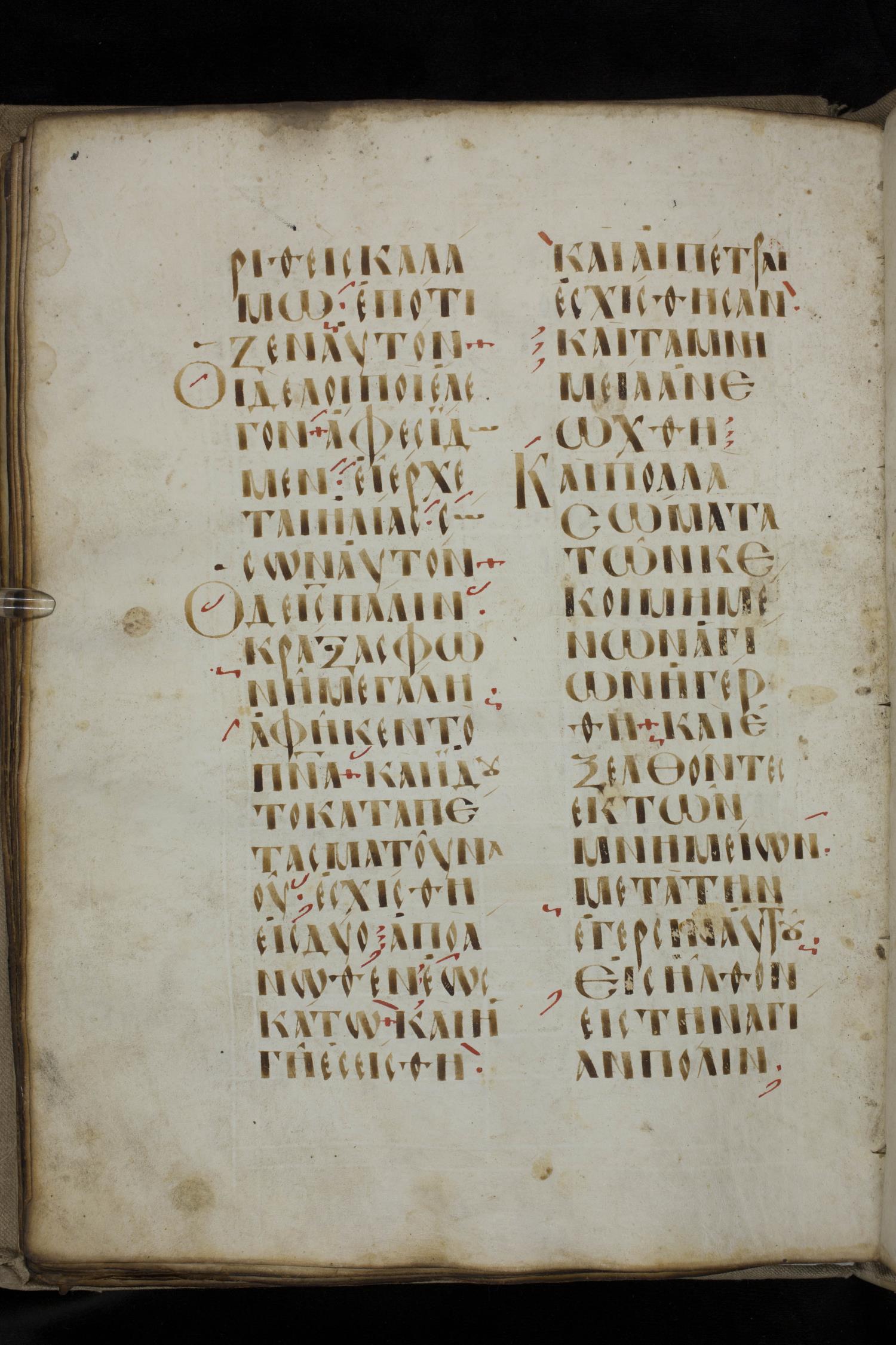 Ninth century majuscule lectionary on parchment; 88 leaves, 2 columns, 20 lines per column. Images were taken at the National Library of Greece in Athens.