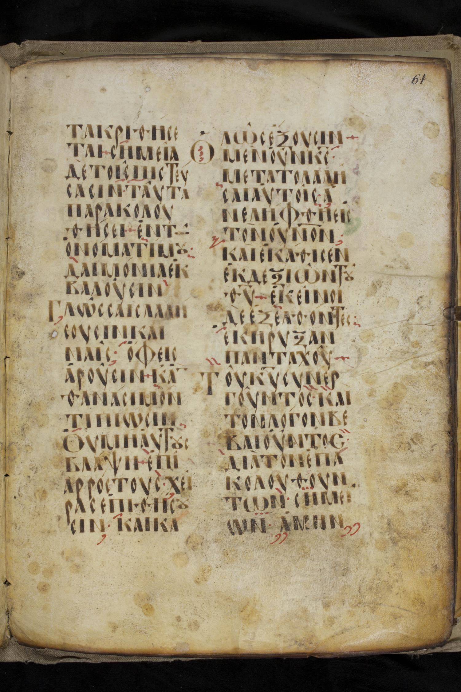Ninth century majuscule lectionary on parchment; 88 leaves, 2 columns, 20 lines per column. Images were taken at the National Library of Greece in Athens.