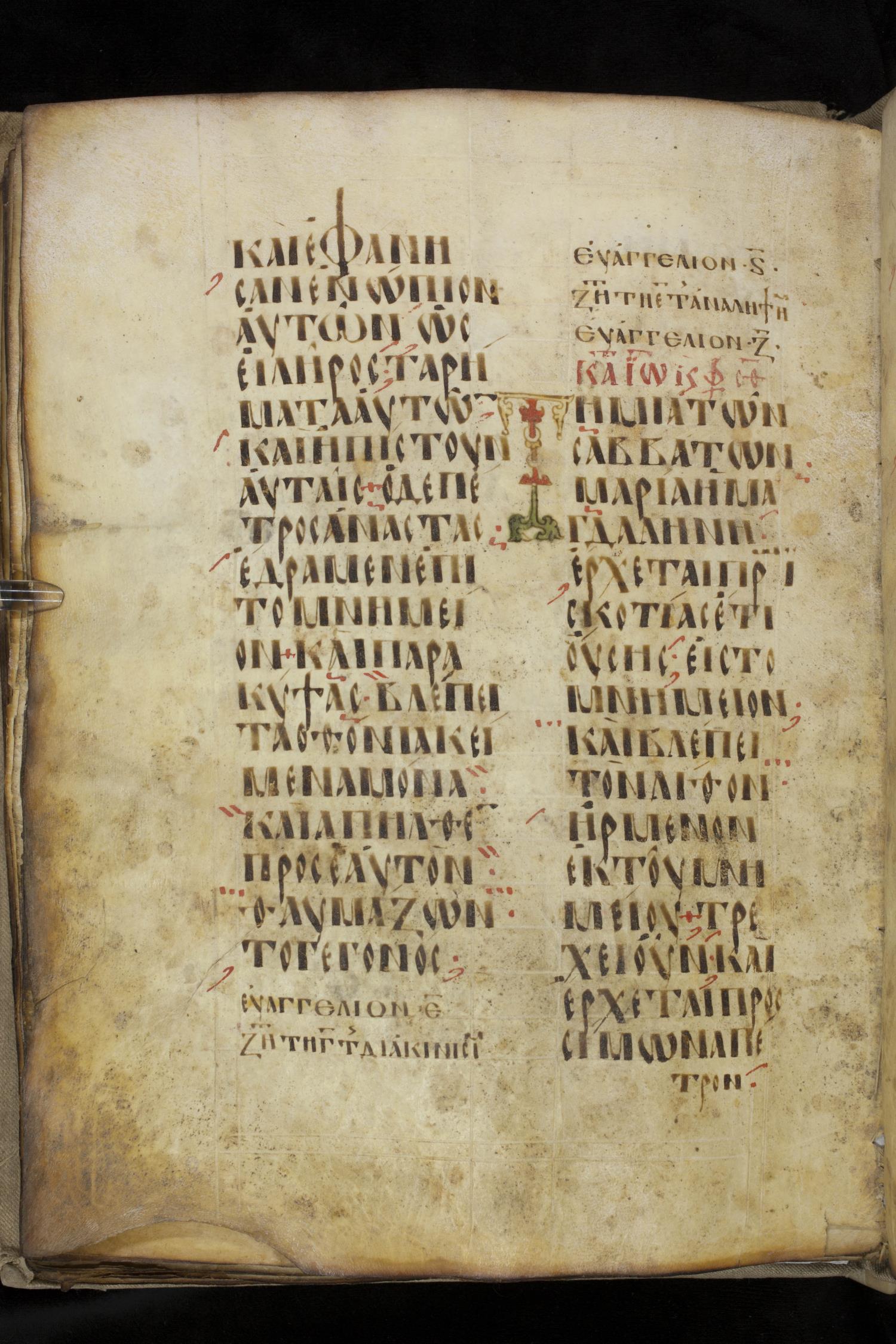 Ninth century majuscule lectionary on parchment; 88 leaves, 2 columns, 20 lines per column. Images were taken at the National Library of Greece in Athens.