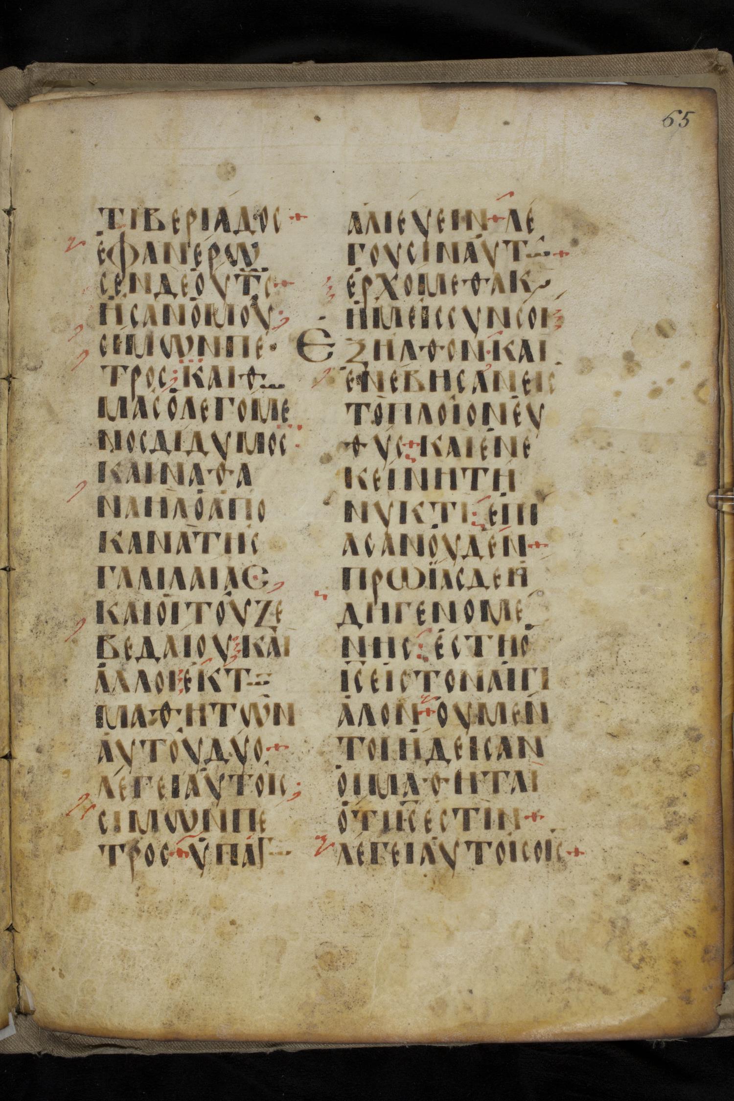 Ninth century majuscule lectionary on parchment; 88 leaves, 2 columns, 20 lines per column. Images were taken at the National Library of Greece in Athens.