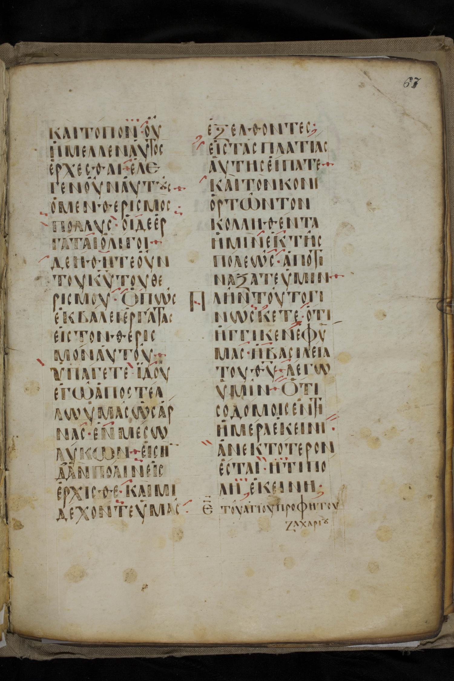 Ninth century majuscule lectionary on parchment; 88 leaves, 2 columns, 20 lines per column. Images were taken at the National Library of Greece in Athens.