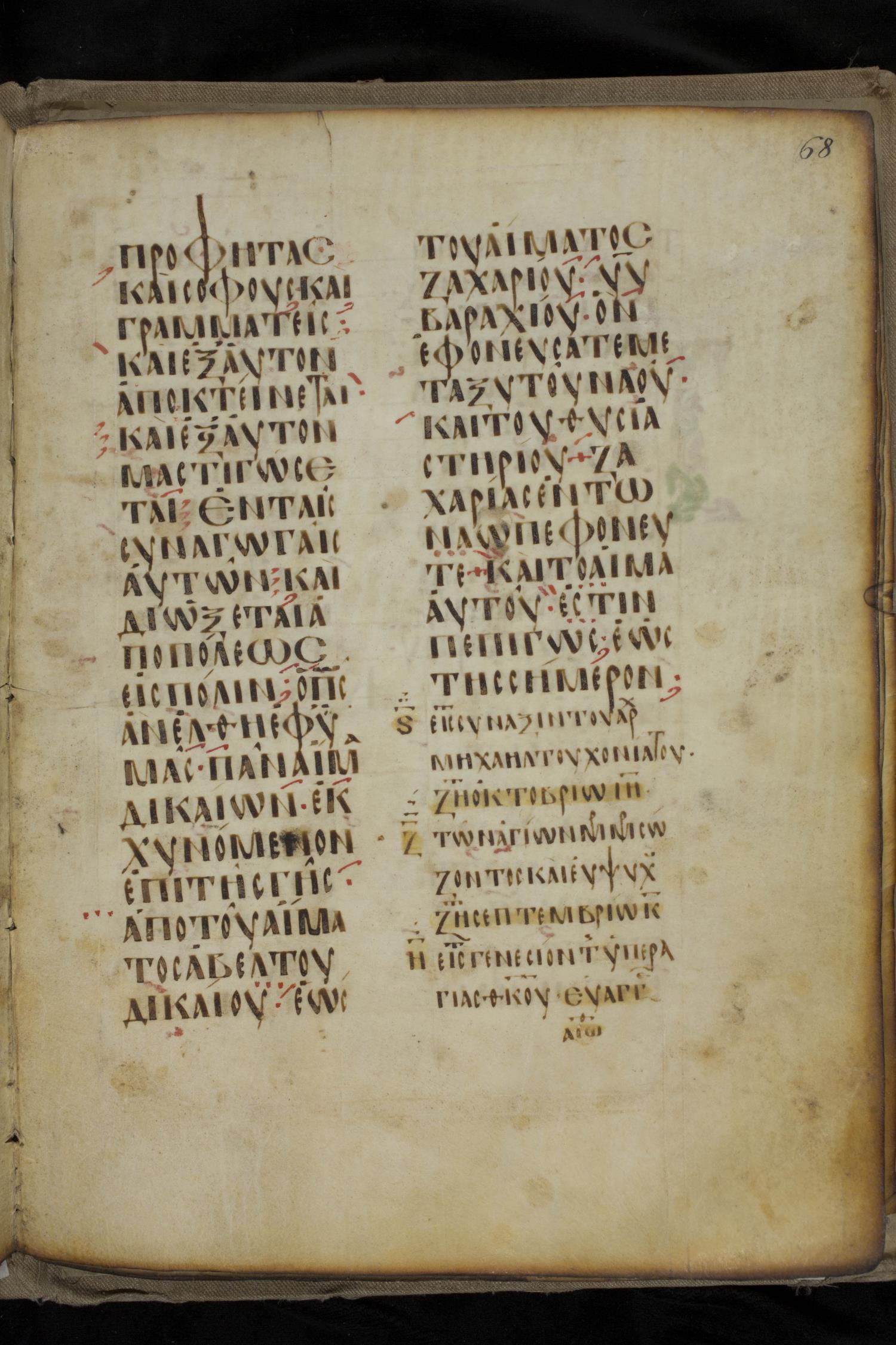 Ninth century majuscule lectionary on parchment; 88 leaves, 2 columns, 20 lines per column. Images were taken at the National Library of Greece in Athens.