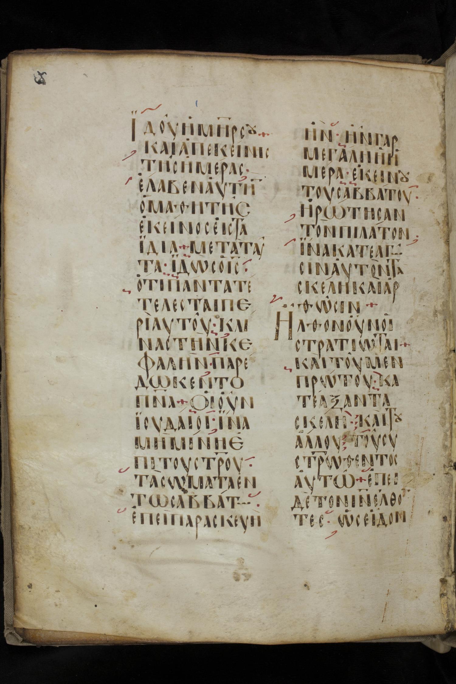 Ninth century majuscule lectionary on parchment; 88 leaves, 2 columns, 20 lines per column. Images were taken at the National Library of Greece in Athens.