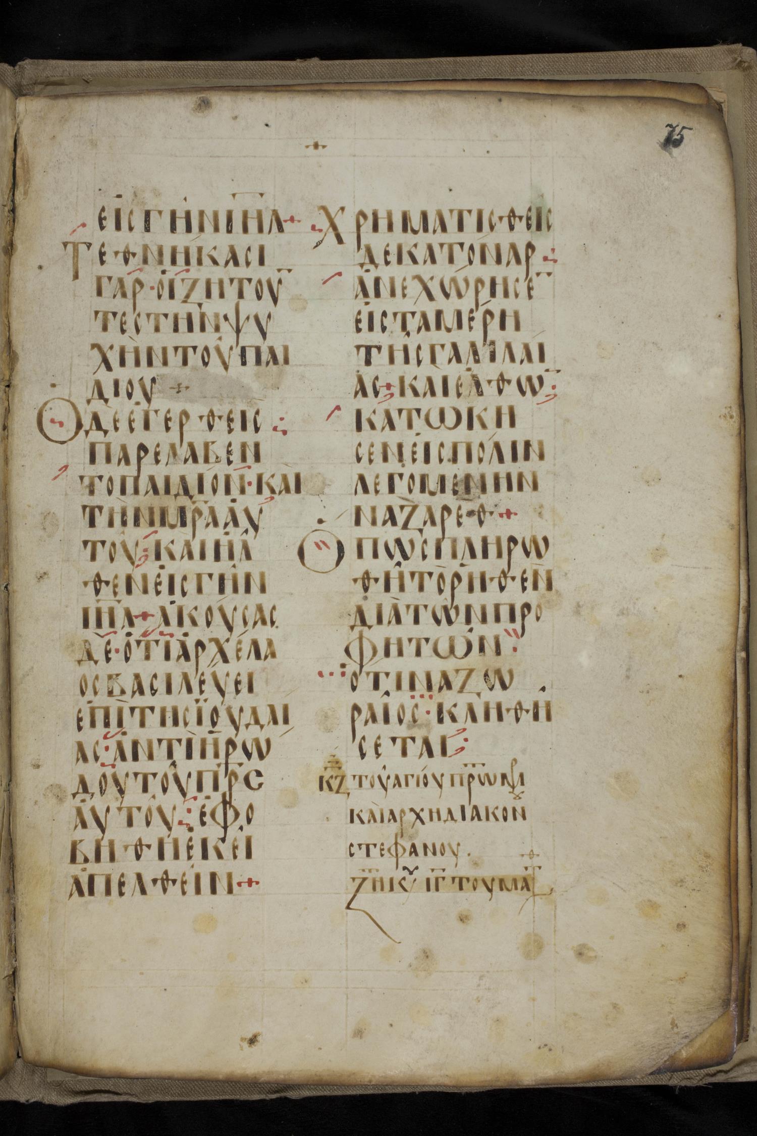 Ninth century majuscule lectionary on parchment; 88 leaves, 2 columns, 20 lines per column. Images were taken at the National Library of Greece in Athens.