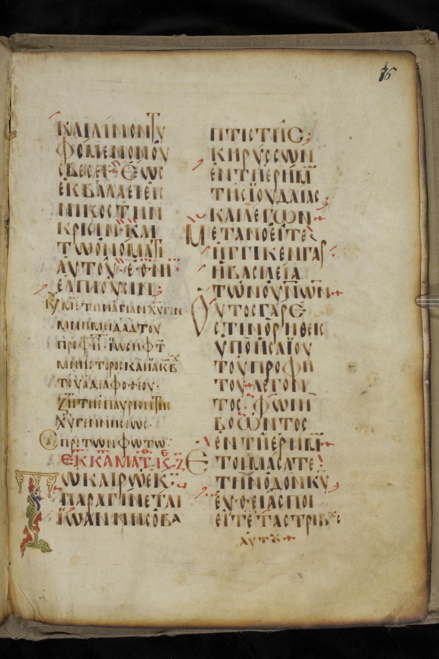 Ninth century majuscule lectionary on parchment; 88 leaves, 2 columns, 20 lines per column. Images were taken at the National Library of Greece in Athens.