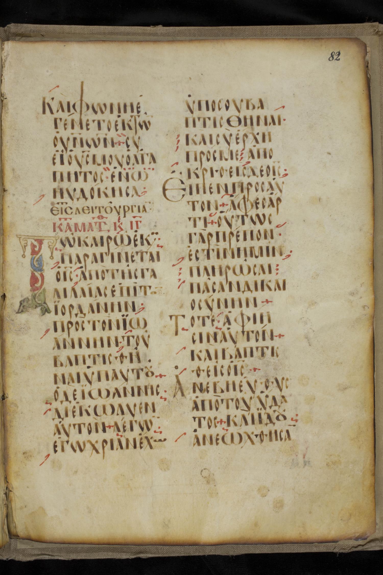 Ninth century majuscule lectionary on parchment; 88 leaves, 2 columns, 20 lines per column. Images were taken at the National Library of Greece in Athens.