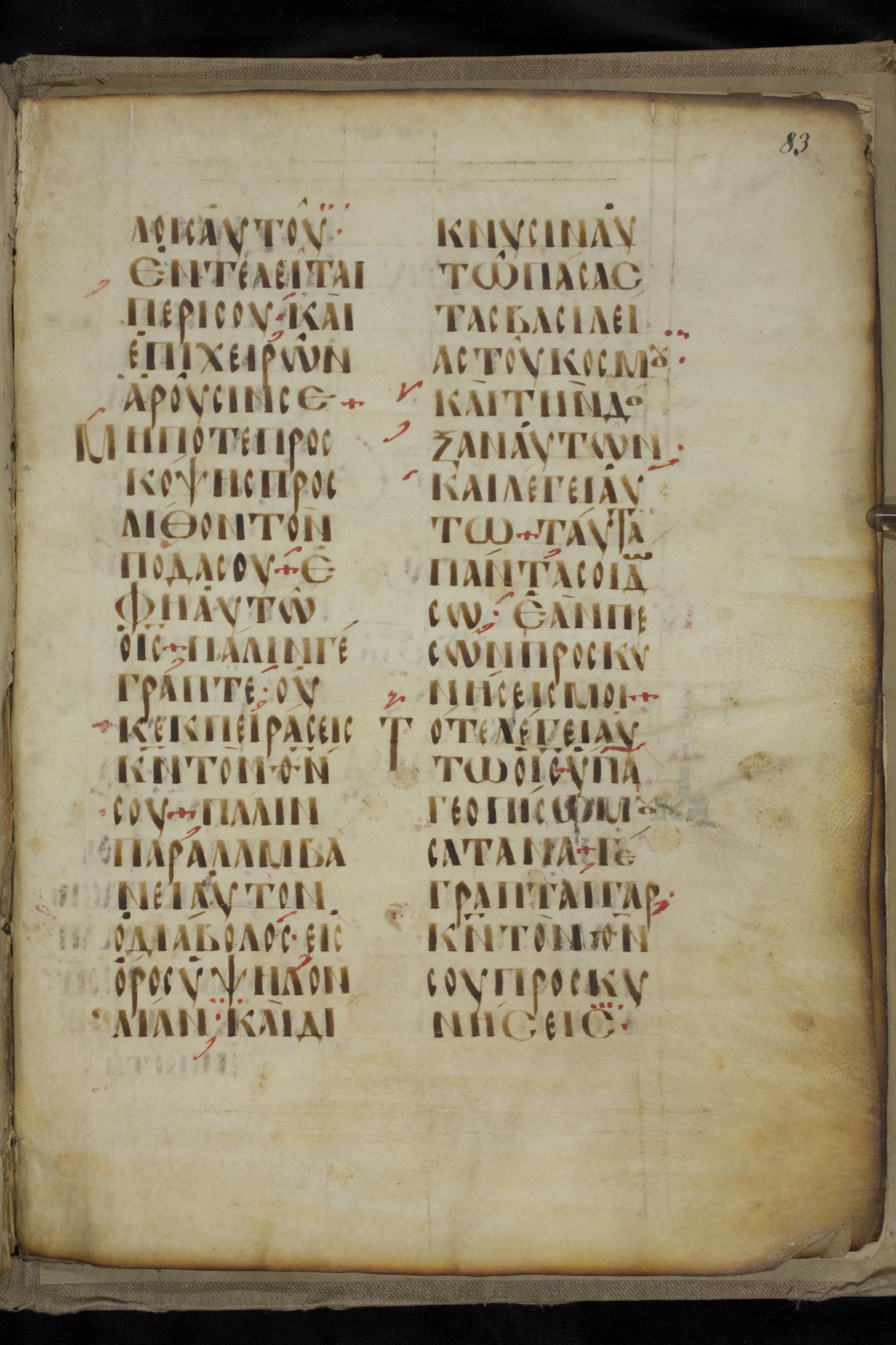 Ninth century majuscule lectionary on parchment; 88 leaves, 2 columns, 20 lines per column. Images were taken at the National Library of Greece in Athens.
