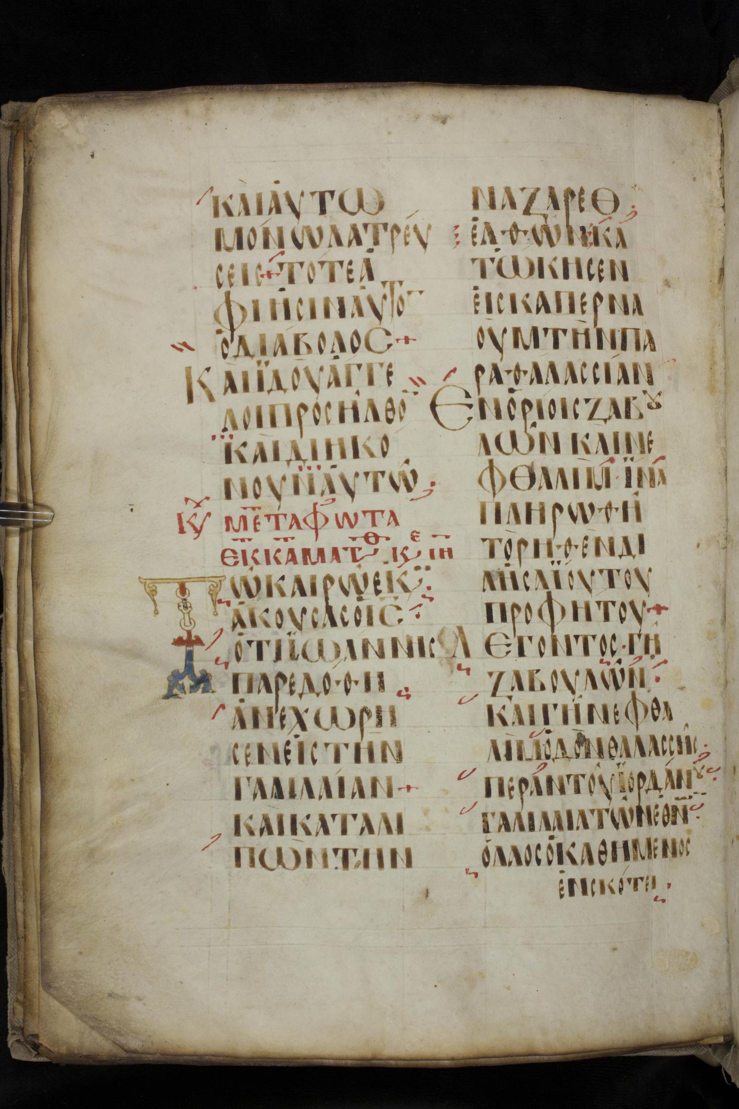 Ninth century majuscule lectionary on parchment; 88 leaves, 2 columns, 20 lines per column. Images were taken at the National Library of Greece in Athens.