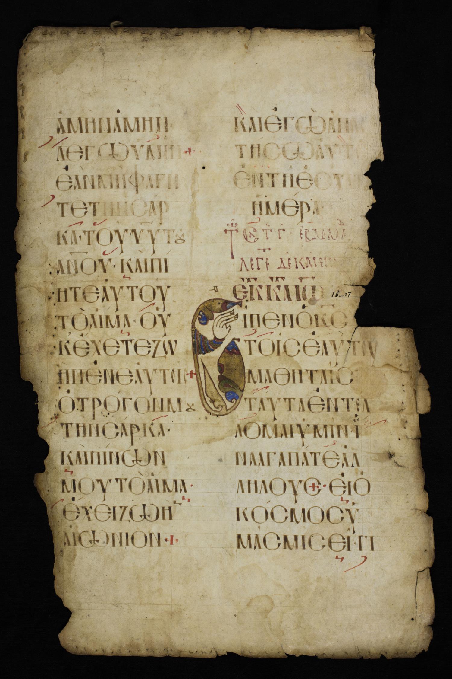 Eleventh century majuscule lectionary of the Gospels on parchment; 2 leaves, 2 columns, 16 lines per column.
