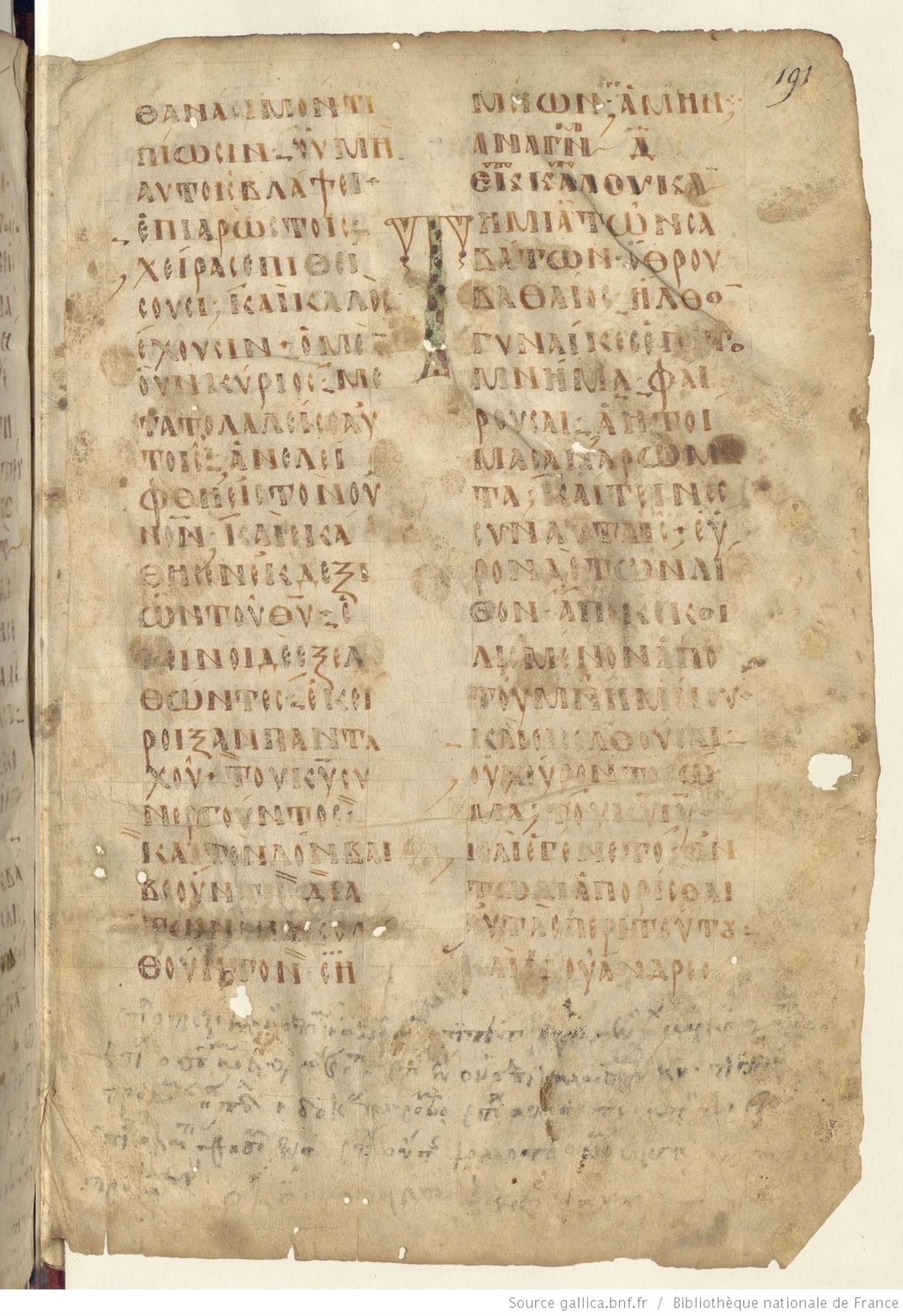 Ninth century majuscule lectionary of the Gospels on parchment; 192 leaves, 2 columns, 23 lines per column.