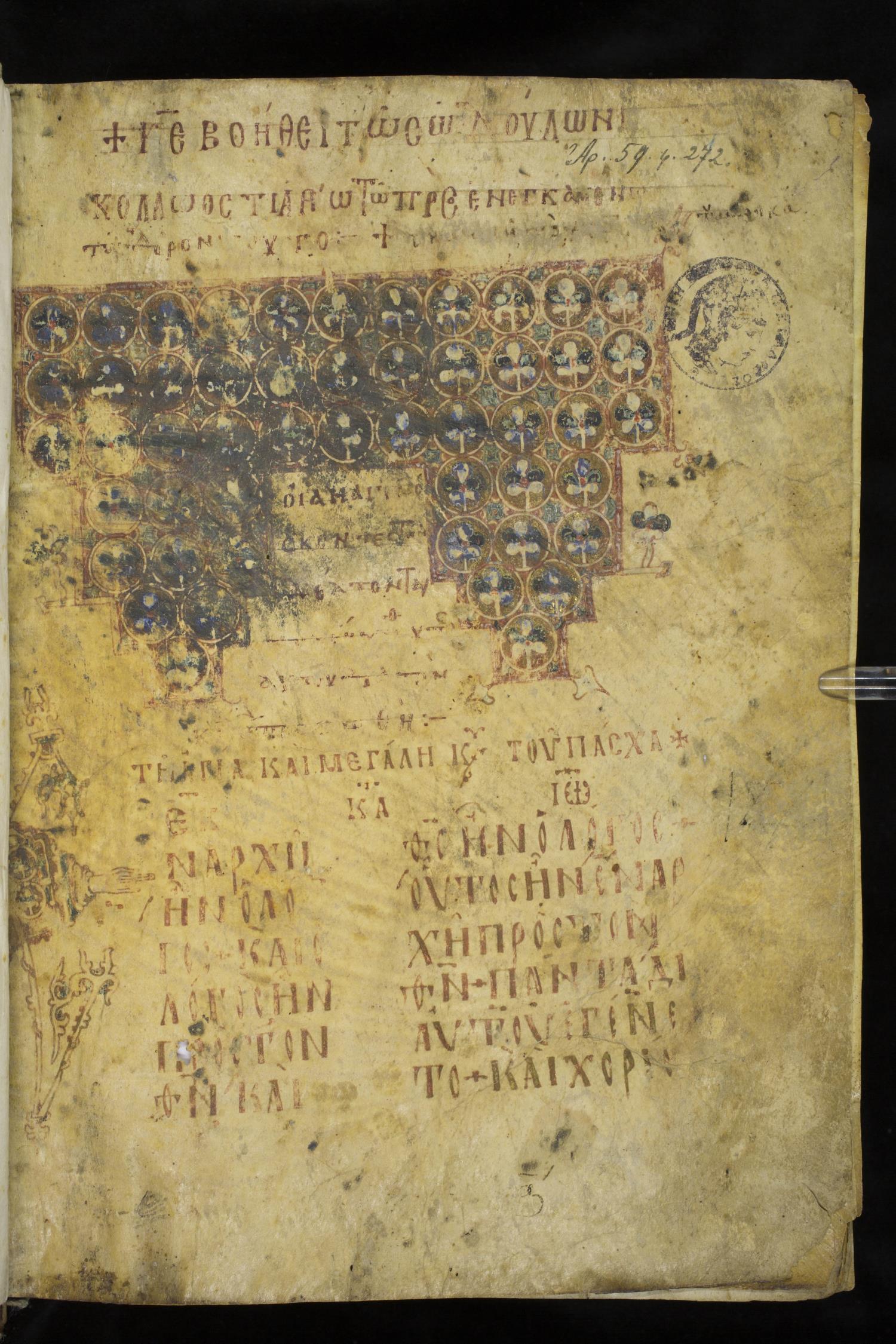 Ninth or tenth century majuscule lectionary on parchment; 273 leaves, 2 columns, 20-21 lines per column. Images were taken at the National Library of Greece in Athens.