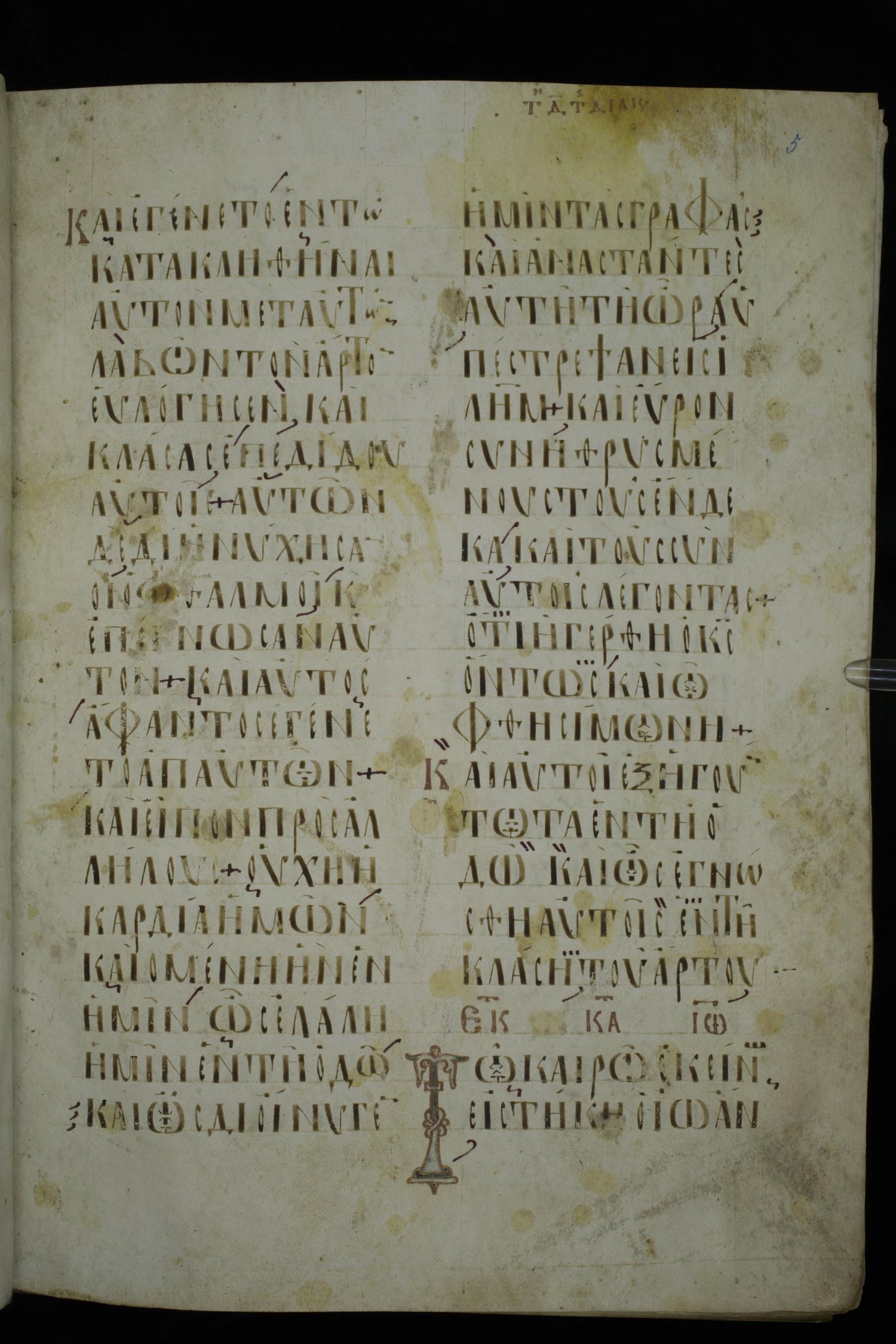Ninth or tenth century majuscule lectionary on parchment; 273 leaves, 2 columns, 20-21 lines per column. Images were taken at the National Library of Greece in Athens.