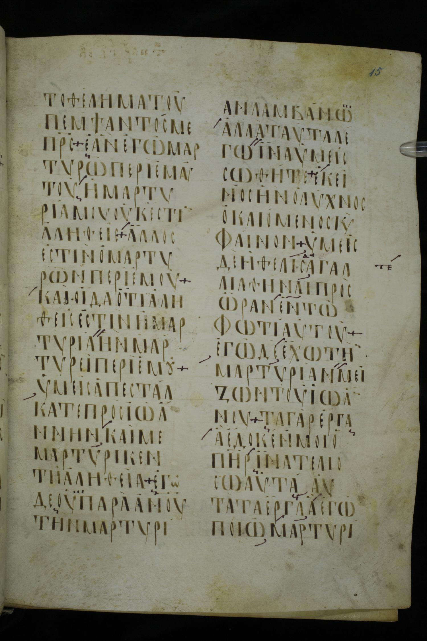 Ninth or tenth century majuscule lectionary on parchment; 273 leaves, 2 columns, 20-21 lines per column. Images were taken at the National Library of Greece in Athens.