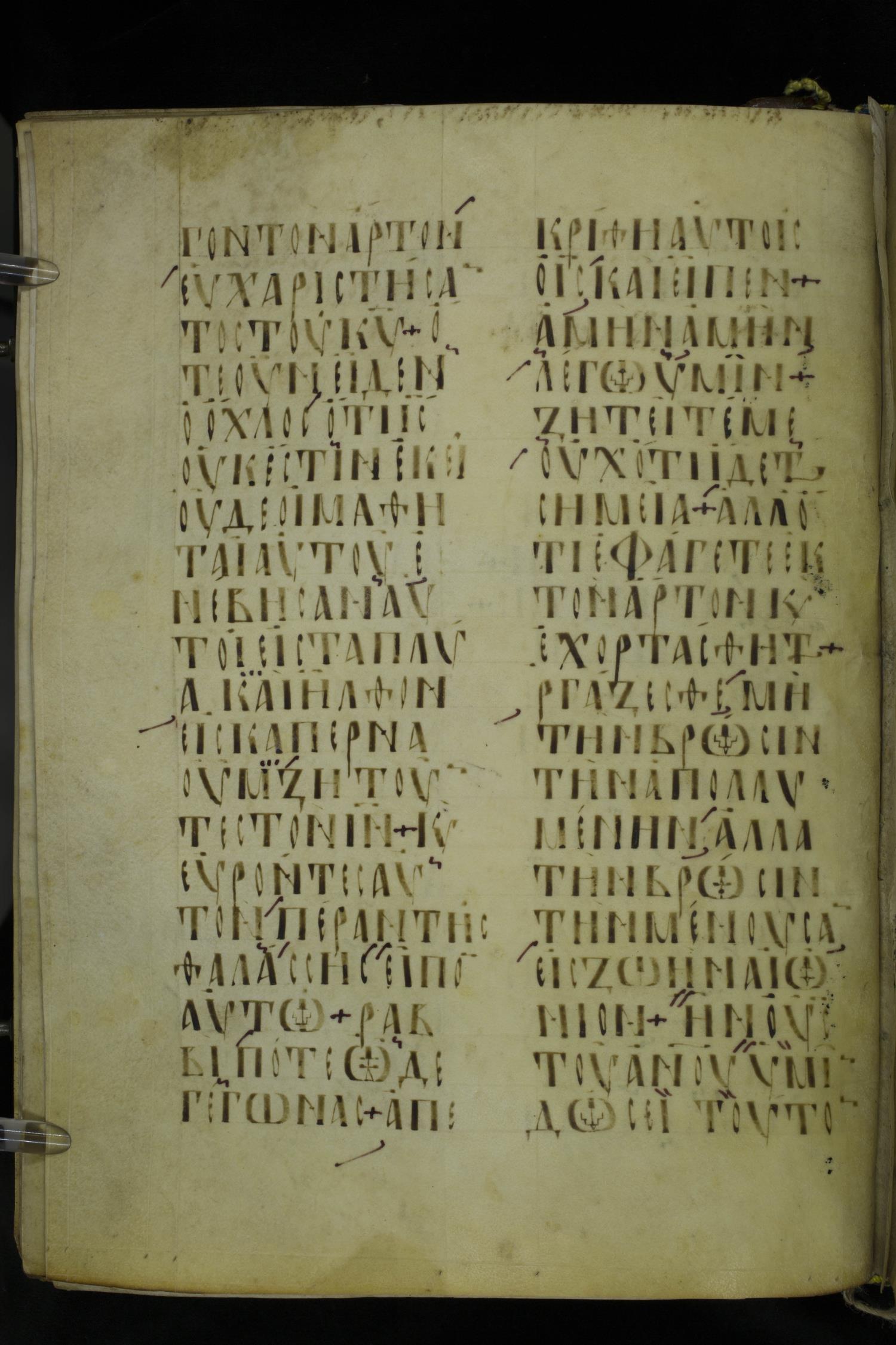 Ninth or tenth century majuscule lectionary on parchment; 273 leaves, 2 columns, 20-21 lines per column. Images were taken at the National Library of Greece in Athens.