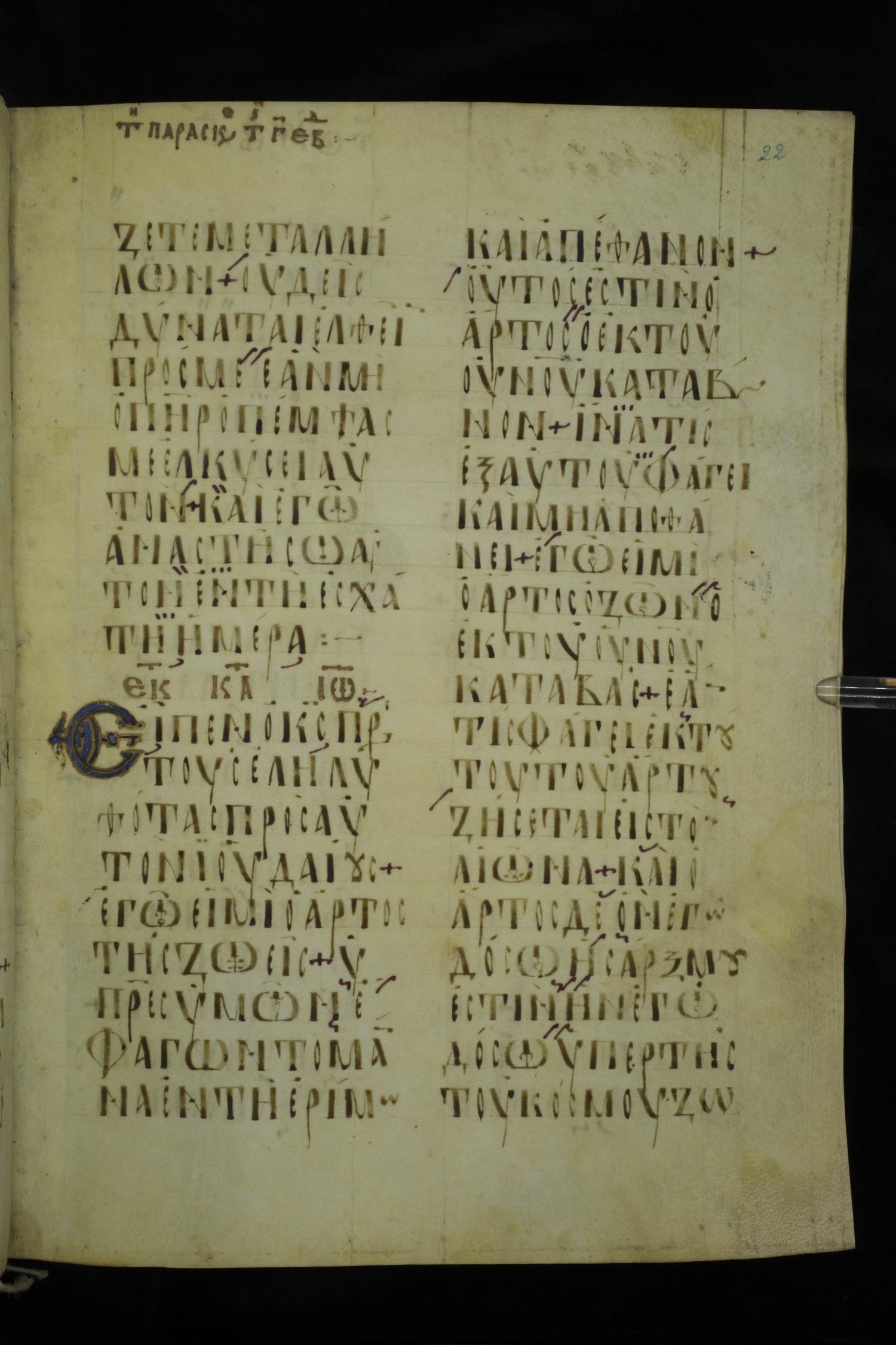 Ninth or tenth century majuscule lectionary on parchment; 273 leaves, 2 columns, 20-21 lines per column. Images were taken at the National Library of Greece in Athens.