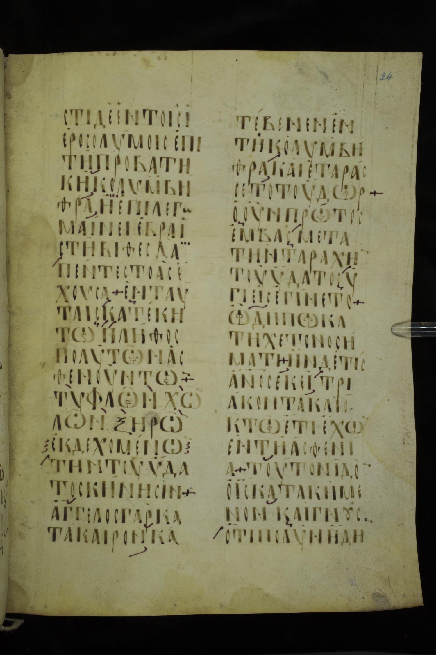 Ninth or tenth century majuscule lectionary on parchment; 273 leaves, 2 columns, 20-21 lines per column. Images were taken at the National Library of Greece in Athens.