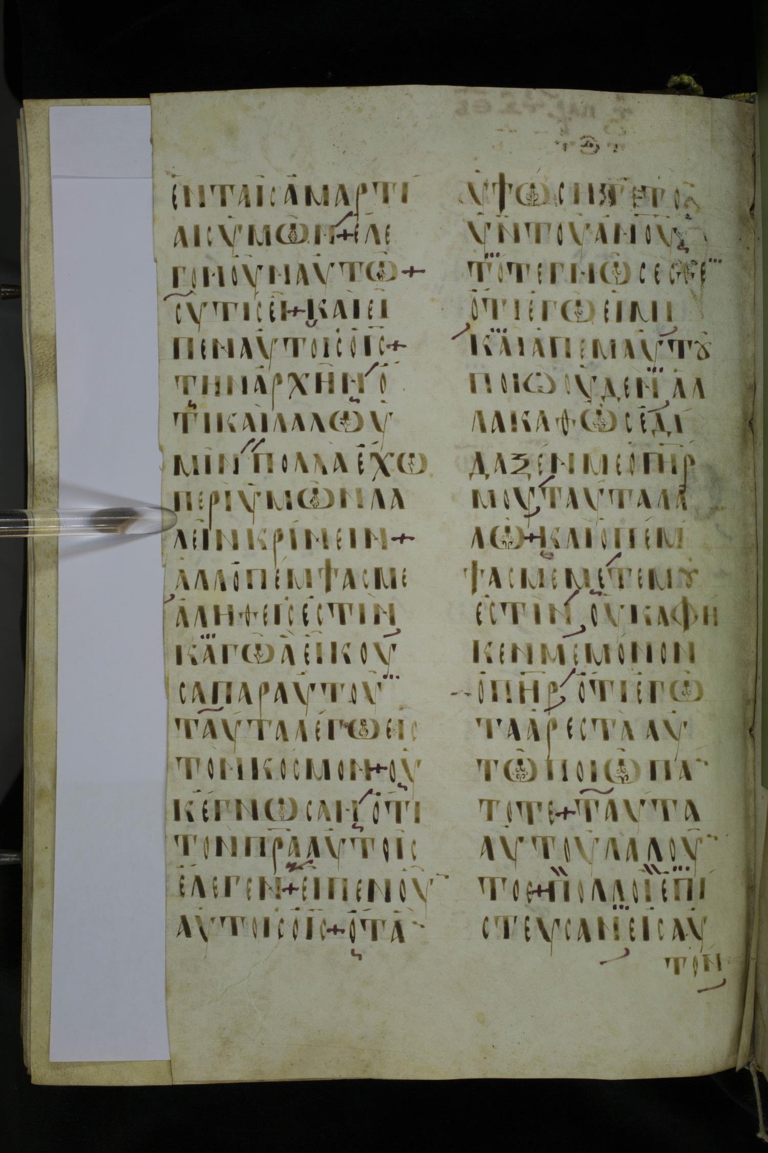 Ninth or tenth century majuscule lectionary on parchment; 273 leaves, 2 columns, 20-21 lines per column. Images were taken at the National Library of Greece in Athens.