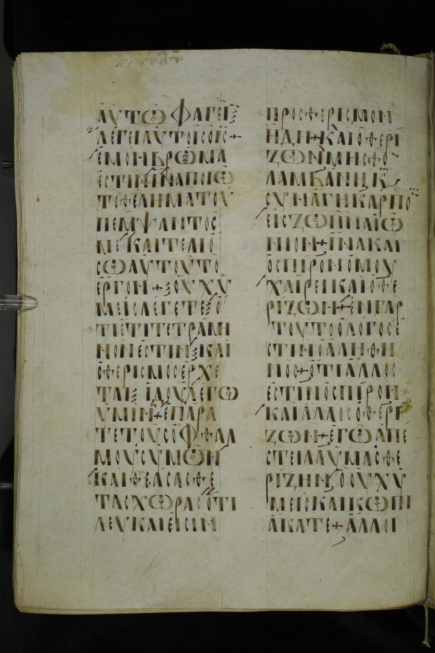 Ninth or tenth century majuscule lectionary on parchment; 273 leaves, 2 columns, 20-21 lines per column. Images were taken at the National Library of Greece in Athens.