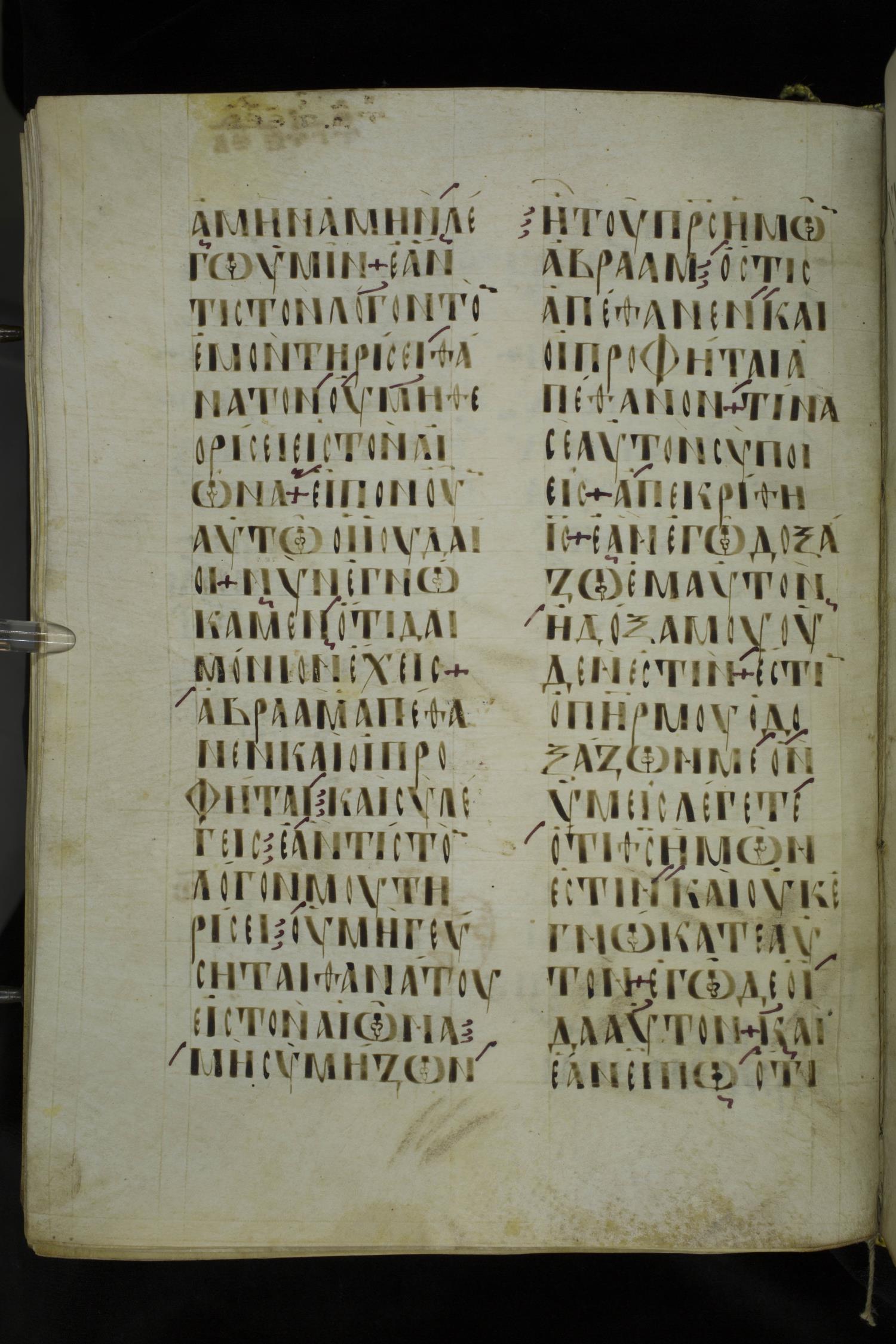 Ninth or tenth century majuscule lectionary on parchment; 273 leaves, 2 columns, 20-21 lines per column. Images were taken at the National Library of Greece in Athens.