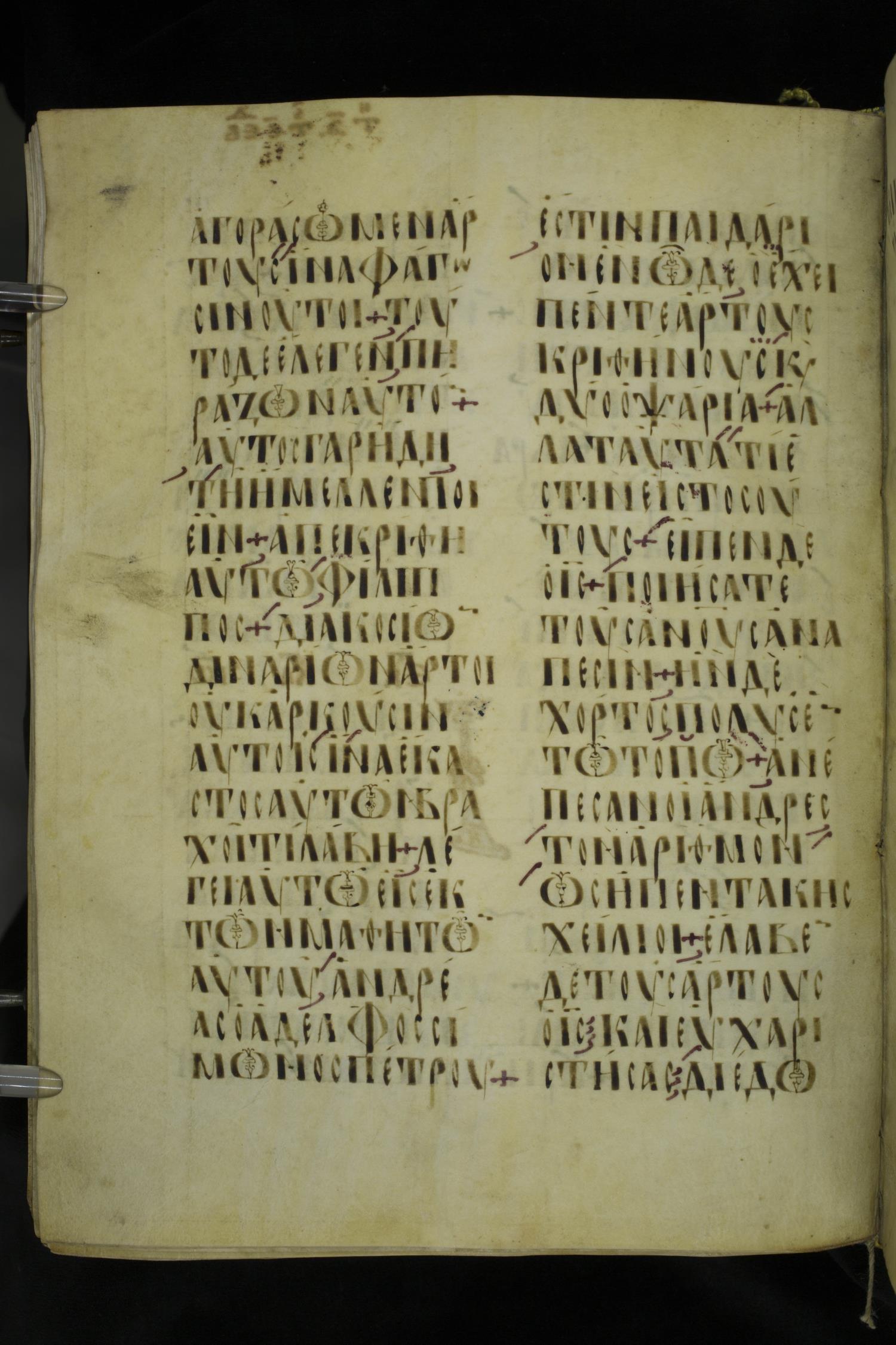 Ninth or tenth century majuscule lectionary on parchment; 273 leaves, 2 columns, 20-21 lines per column. Images were taken at the National Library of Greece in Athens.