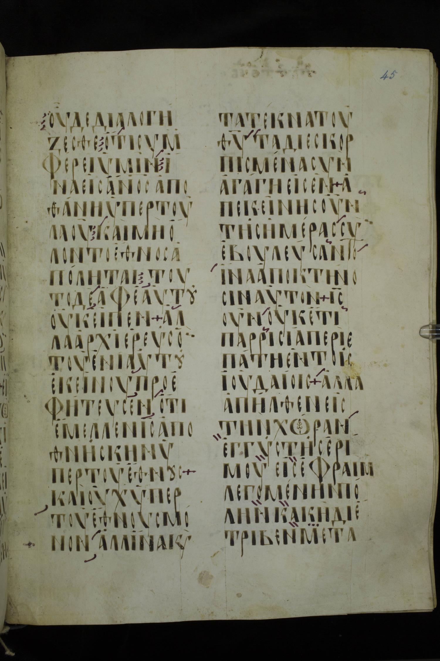 Ninth or tenth century majuscule lectionary on parchment; 273 leaves, 2 columns, 20-21 lines per column. Images were taken at the National Library of Greece in Athens.