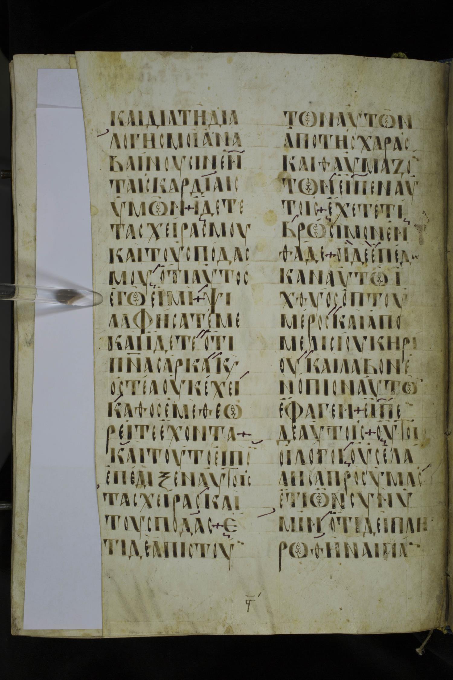 Ninth or tenth century majuscule lectionary on parchment; 273 leaves, 2 columns, 20-21 lines per column. Images were taken at the National Library of Greece in Athens.