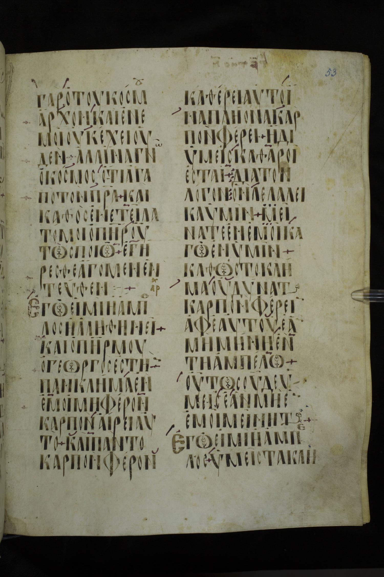 Ninth or tenth century majuscule lectionary on parchment; 273 leaves, 2 columns, 20-21 lines per column. Images were taken at the National Library of Greece in Athens.