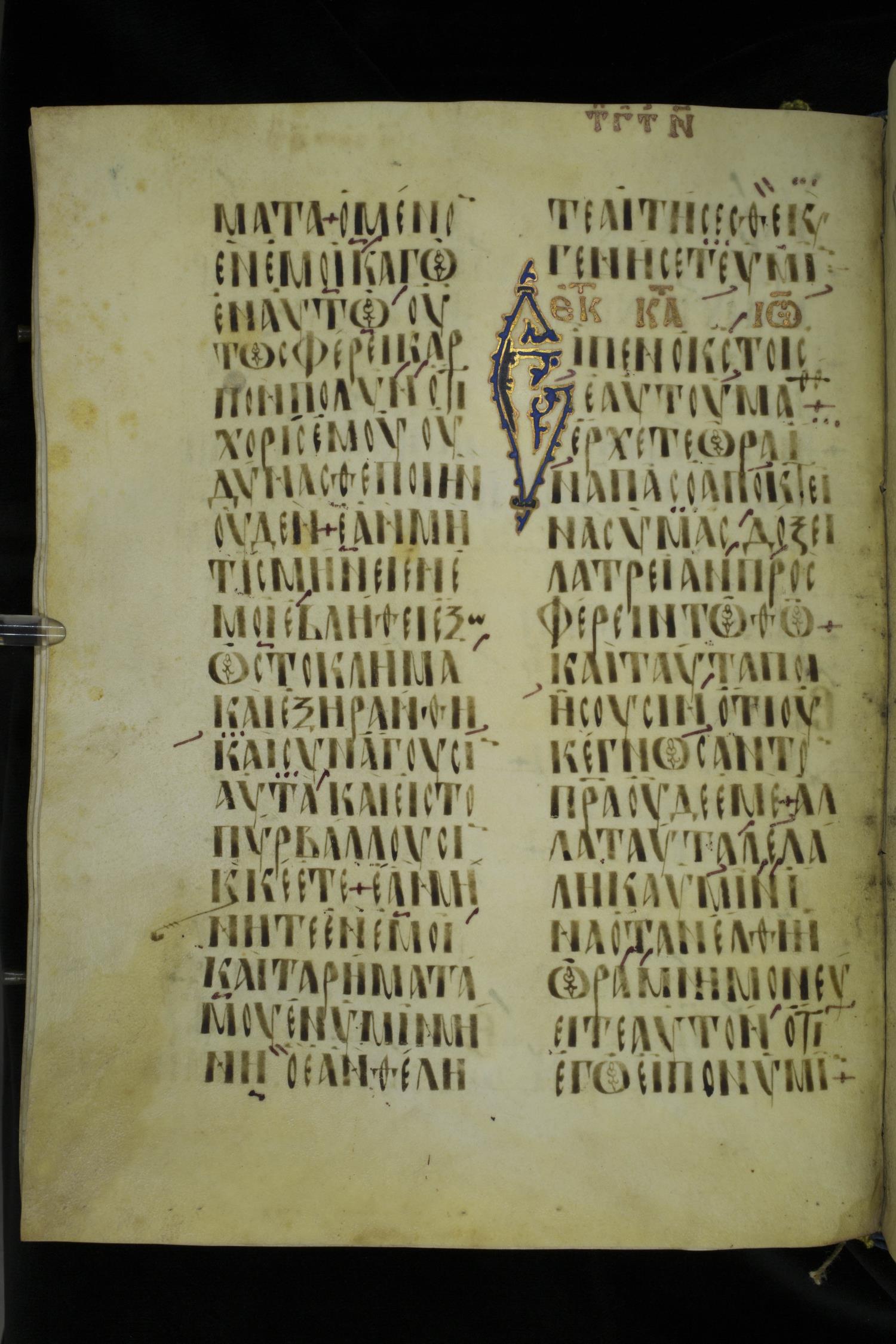 Ninth or tenth century majuscule lectionary on parchment; 273 leaves, 2 columns, 20-21 lines per column. Images were taken at the National Library of Greece in Athens.