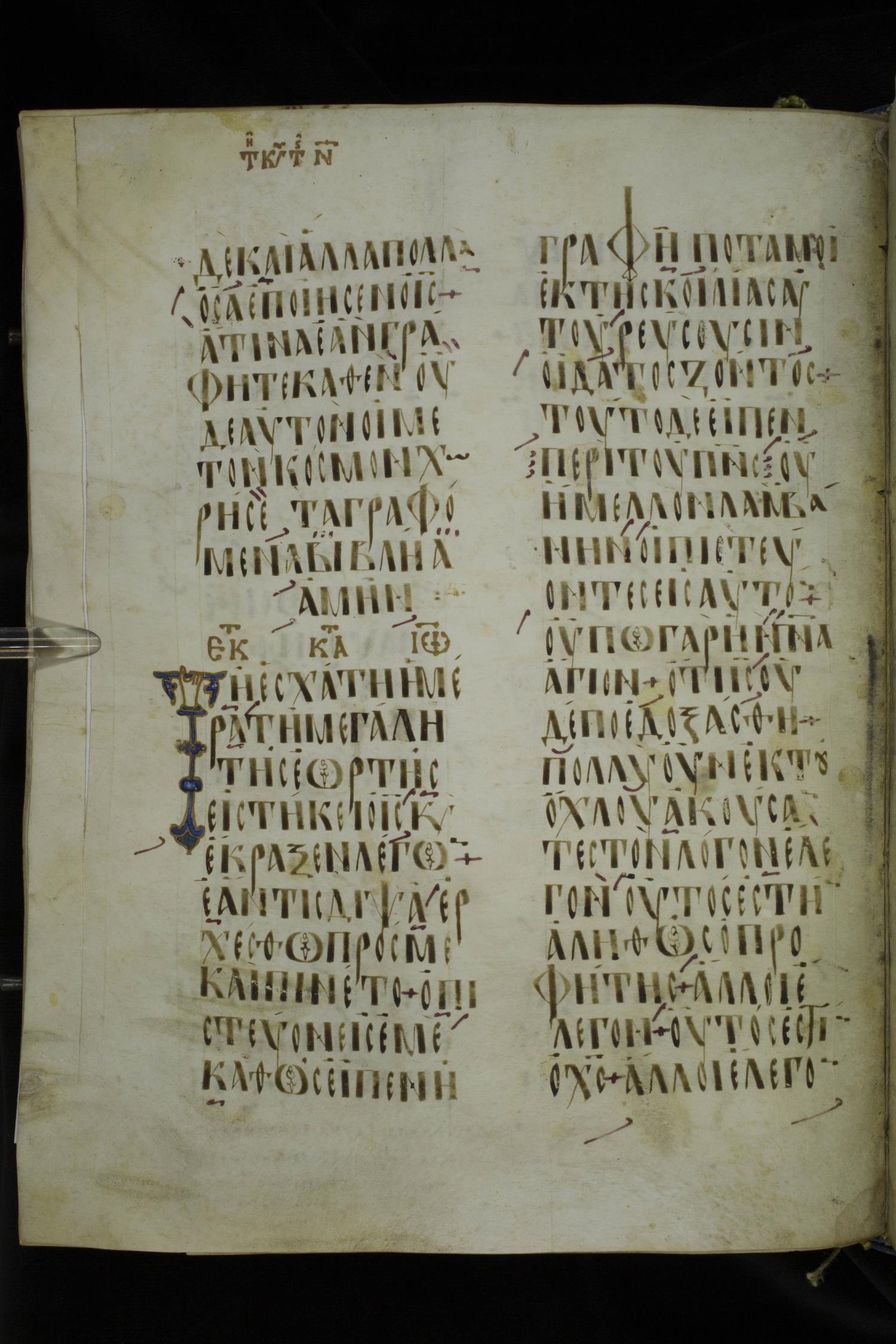 Ninth or tenth century majuscule lectionary on parchment; 273 leaves, 2 columns, 20-21 lines per column. Images were taken at the National Library of Greece in Athens.