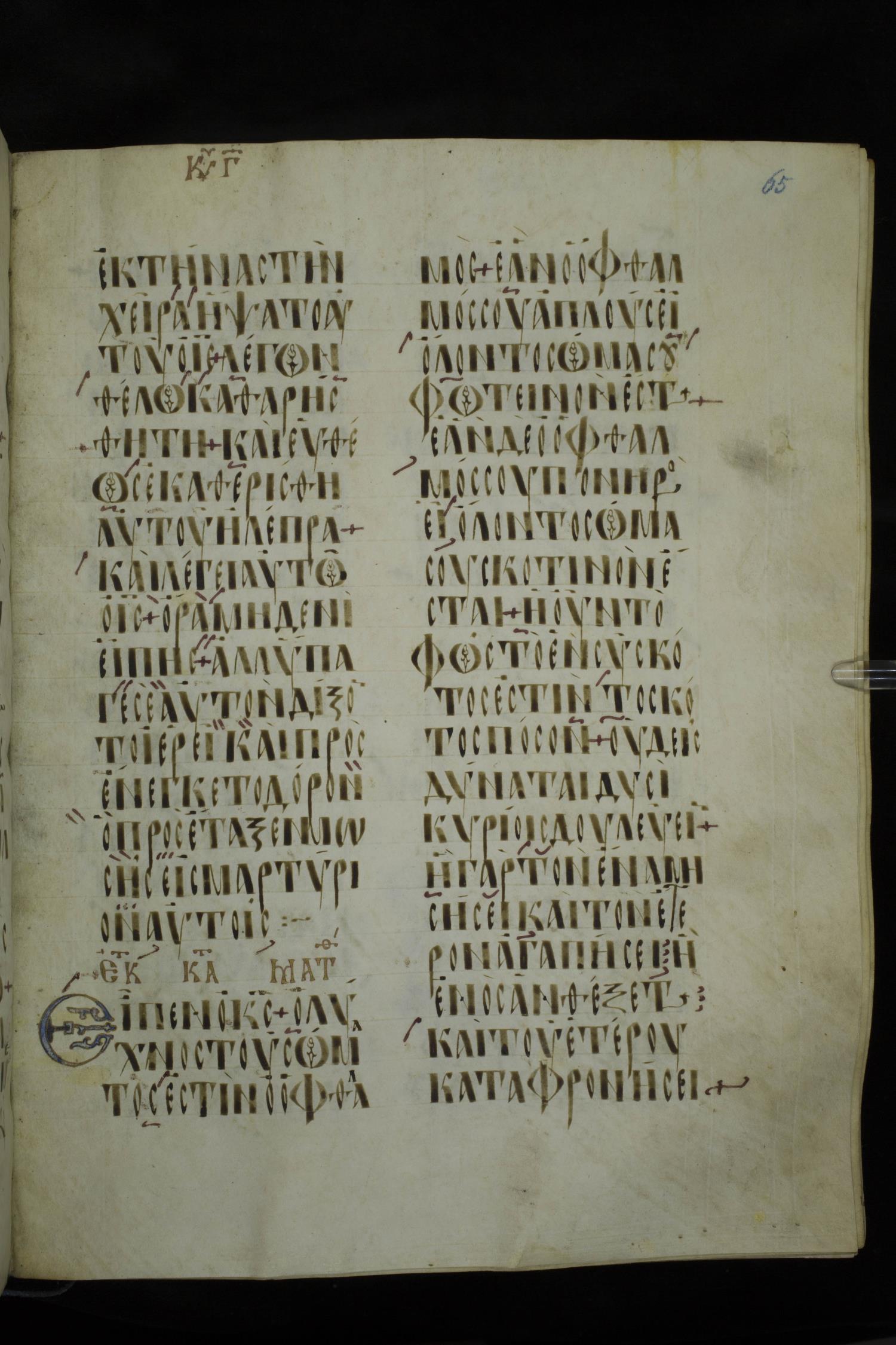 Ninth or tenth century majuscule lectionary on parchment; 273 leaves, 2 columns, 20-21 lines per column. Images were taken at the National Library of Greece in Athens.