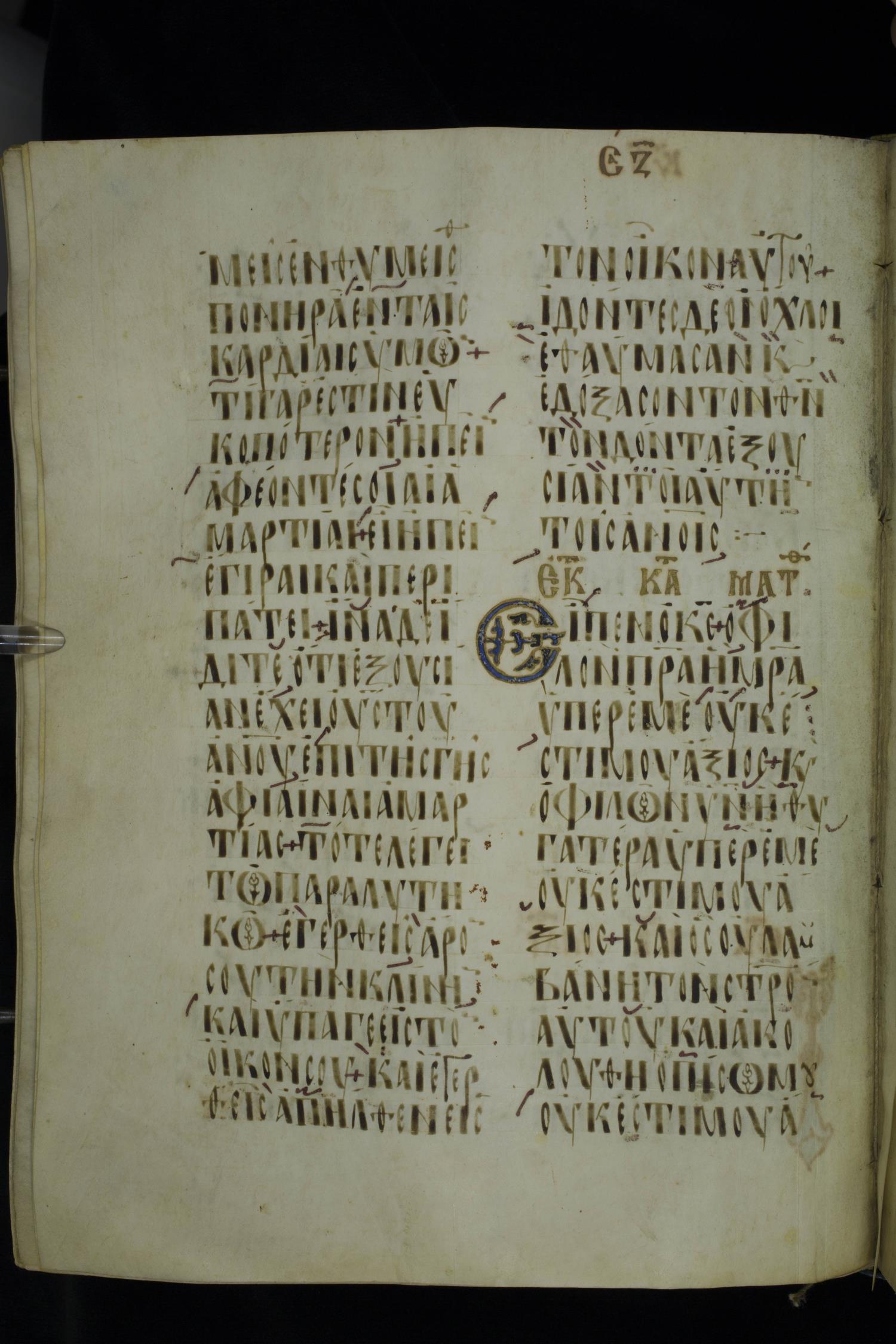 Ninth or tenth century majuscule lectionary on parchment; 273 leaves, 2 columns, 20-21 lines per column. Images were taken at the National Library of Greece in Athens.
