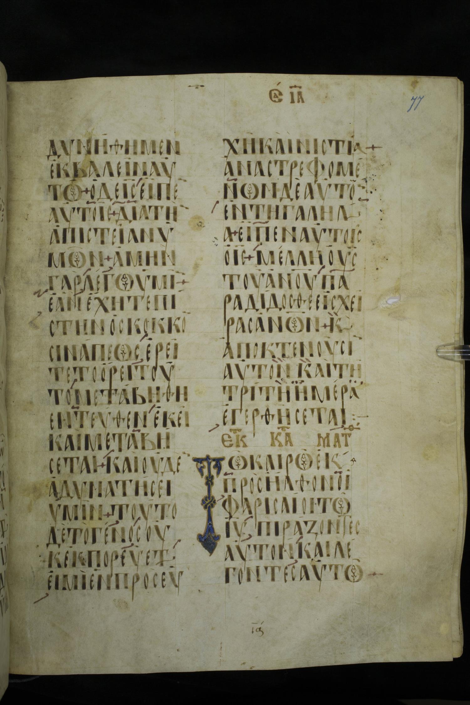 Ninth or tenth century majuscule lectionary on parchment; 273 leaves, 2 columns, 20-21 lines per column. Images were taken at the National Library of Greece in Athens.