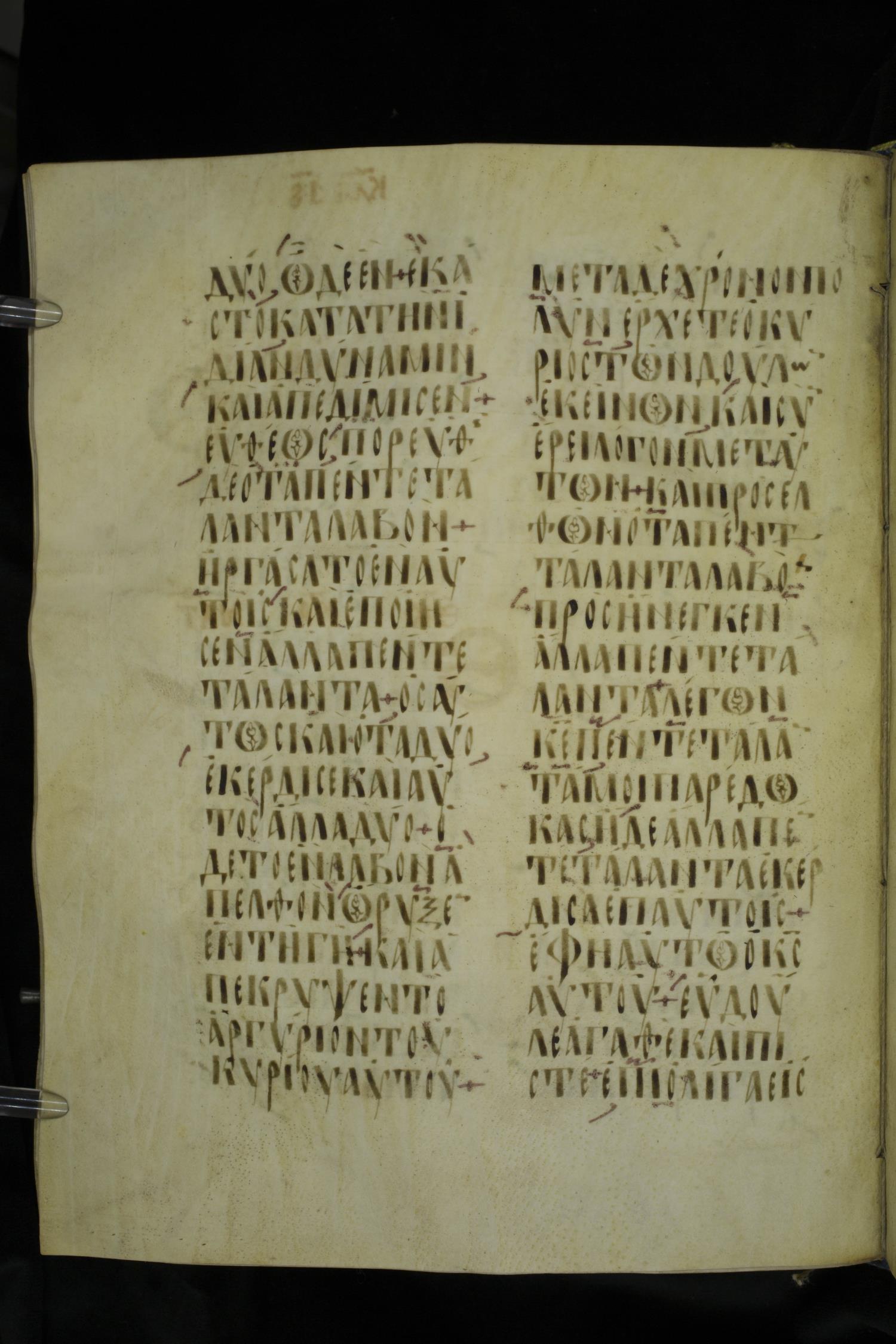 Ninth or tenth century majuscule lectionary on parchment; 273 leaves, 2 columns, 20-21 lines per column. Images were taken at the National Library of Greece in Athens.